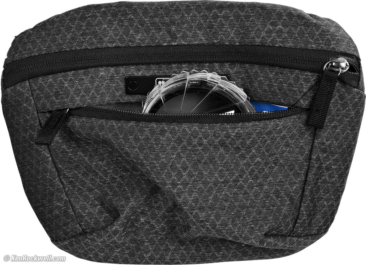 There's a soft, fuzzy pocket behind the main area, perfect for filters or a phone: Think Tank 20th Anniversary Sling Bag with Canon RF 24-105mm IS STM, Hoya 67mm HRT Circular Polarizer and a Tiffen 67mm 0.6 ND Grad. bigger.