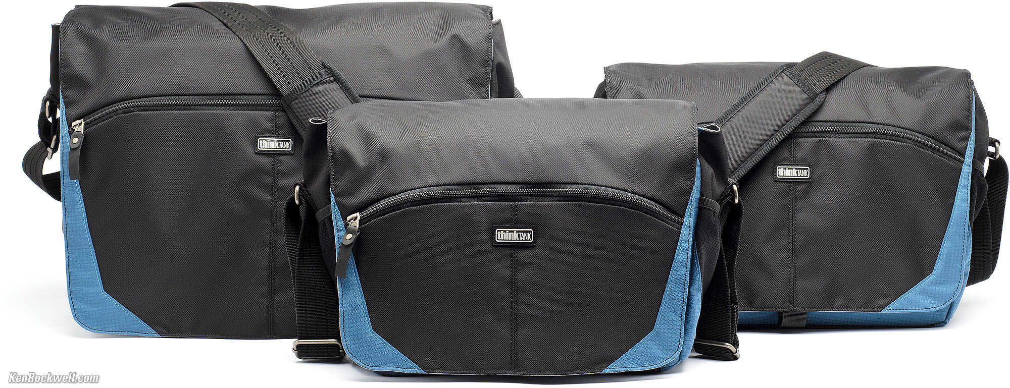 Think Tank's new CityWalker bags are notable because they are so much lighter than other similar bags. There are three sizes: CityWalker 30, CityWalker 20 and CityWalker 10. The 30 weighs about 3 pounds (1.3 kg), the 20 weighs about 2.2 pounds (1 kg) and the 10 weighs about 2 pounds (0.9 kg). Each has three sections inside: a central one for your body and lens pointed down, and two more sections, one on each side, each for holding a lens, lenses or flash. Each bag also has a place to hide an iPad (the CityWalker 30 will hide a laptop), and lots of other storage. I have the CityWalker 20. It's big enough to swallow a pro body like a D3, D4 or 1D X with 24-70/2.8, and two more fat zooms like a 16-35mm. A 70-200/2.8 will fit in either slot, but you may have to nudge the body to one side a bit. In fact, the CityWalker 20 is a bit too big for these pro zooms. There is still plenty of air around each lens; the sections are bigger than they need to be in the CityWalker 20. My CityWalker 20 won't hold a laptop in its iPad slot, but my 12" iBook G4 easily fits between the bag walls and the padded camera holding section. My 13" MacBook Pro probably fits, too, but if you jam a laptop in the CityWalker 20, there's less room for a tall pro body. The CityWalker 30 is even bigger, being even taller to hold longer lenses, and it's also deeper, for lenses much fatter than anything available today. The CityWalker 10 is the most reasonably sized, with lens sections still able to hold pro lenses, but not as deep so the longest won't fit as well. With all of these, of course you can stack smaller lenses on top of each other. There are no bottom nubbins. Put your bag down on the dirt , concrete or in the wet, and the whole bottom of the bag sits on it. The neck strap is a fat 2" (5cm) wide and has a foot-long (30 cm) soft grippy padded pad. There is also a smaller, shorter carry strap for just grabbing the bag as it sits. The CityWalker comes with a seam-sealed rain cover. There are loads of storage flaps. On the outside, the overall flap has a big zippered pocket. On the inside of the flap there is a business card holder, and deactivators for the velcro if you want silent access. In addition to velcro, there is a plastic latch to lock it closed. Once you flip it open, there is another big flap on the outside of the bag for chargers and/or flash, and inside of which are lots of smaller pockets for memory cards and pens. Inside the bag on the away side is the flap that can hold your iPad or laptop. The biggest part of the bag is the three section camera and lens holders. You can take out this divider section to use the bag as a diaper or lunch bag with all one big compartment. Outside the bag on left and right are mesh holders for water or flashes. Inside the bag on each side are more pockets for flash, chargers and cords. Inside the bag nearest you is yet a third big flat zippered storage area for secret papers.