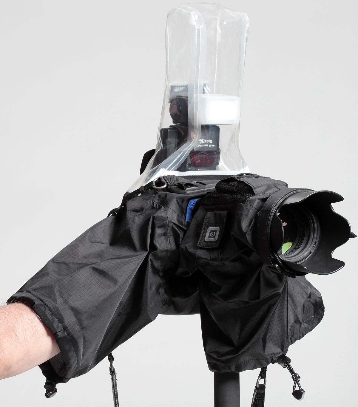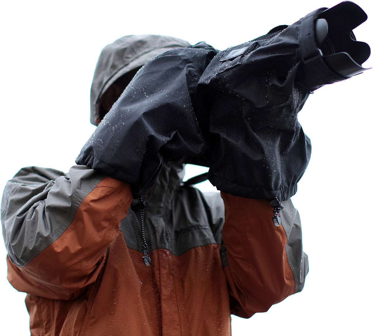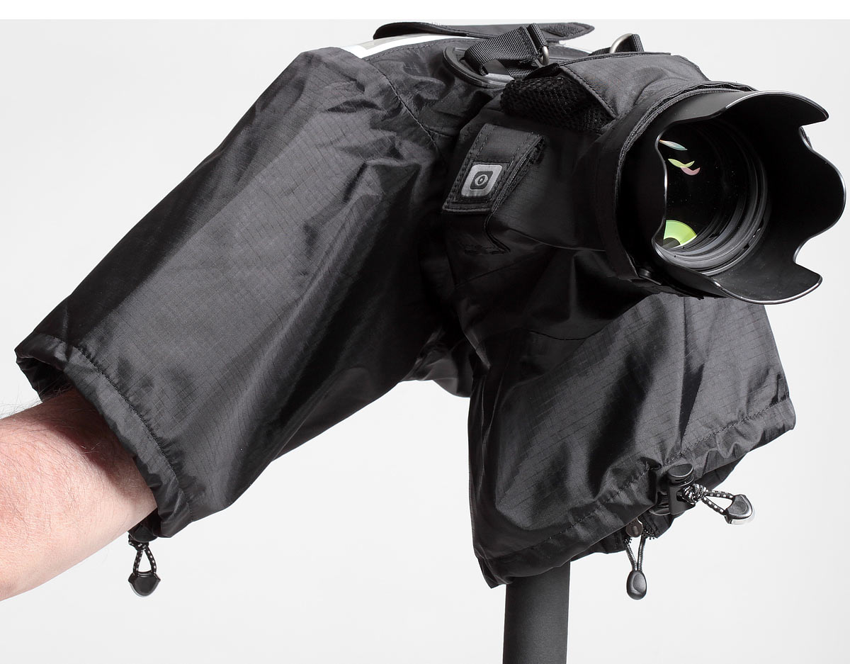 The Think Tank Hydrophobia 70-200 is a rain cover intended for use with SLRs and a 70-200 pro zoom. The Hydrophobia is intended for professional shooting in rain, snow, sleet, flying mud, salt spray and water-over-the-bow. It's not an underwater housing. It has two big sealed arm ports that come in from underneath so you can control everything on your camera and lens directly. It's is a tough professional product, designed with numerous clever features inspired from constant input from working pros. It's not just another dinky rain flap. Thank goodness this isn't me. enlarge. This cover needs a dedicated eyepiece sold separately to match each kind of camera. If you've got different cameras, you need only buy different eyepieces, not different covers. The front of the Hydrophobia cover snugs around the lens hood, while the dedicated eyepiece pokes through the back. The Hydrophobia cover has its own strap lugs and its own carry strap with which to hold your camera. If you have a strap on your camera, it snugs away in its own holder inside the cover so it doesn't get in the way. The cover has a flap to cover the eyepiece when not in use. There is also a stowed, tethered front cover which, like a shower cap, can cover the front of the lens if you like to leave your camera set up in the elements if you step away. The back of the cover is clear so you can see buttons and LCDs. This clear material seems like the same tough, clear flexible plastic that's used in convertible tops. The clear plastic in the sample I had seemed to have some sort of residual milkiness to it in spots. It is very tough and very flexible; it is not anything like the clear plastic we've seen in camera bags or cheap cases and covers.