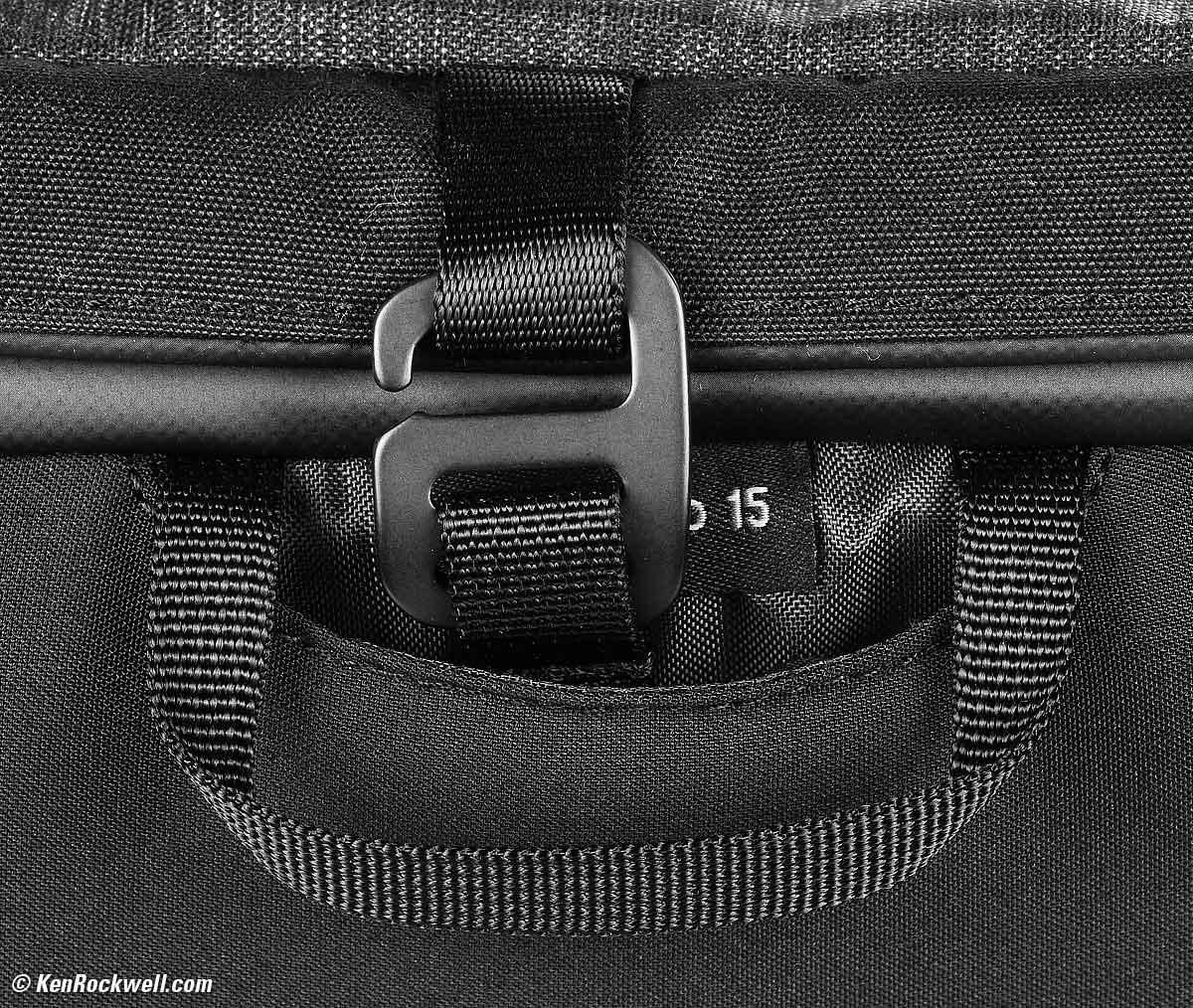 Think Tank's newest SpeedTop shoulder bags use magnetic closures to keep the top closed. This is faster and easier for active shooting than the usual velcro closures. There are two sizes, the smaller SpeedTop 10 and the larger SpeedTop 15 as shown here. Both are regular three-section bags, with two vertical dividers inside that let you have a downward-facing camera with lens in the middle and another lens or flash on either side. Rear, ThinkTank SpeedTop 15. bigger. You can thread a belt through the top of the rear for use with a belt system. The top is connected at the front edge, so at the top rear edge there are magnets at each side to snap the top closed. There's a metal locking top closure at the top rear center: Metal Top-Cover Lock & Rear Handle. bigger. The smaller rear handle lets you move around the bag and everything in it.