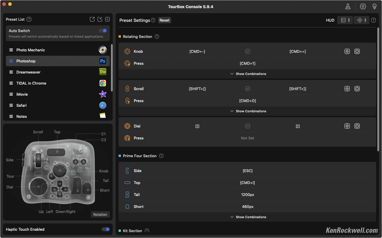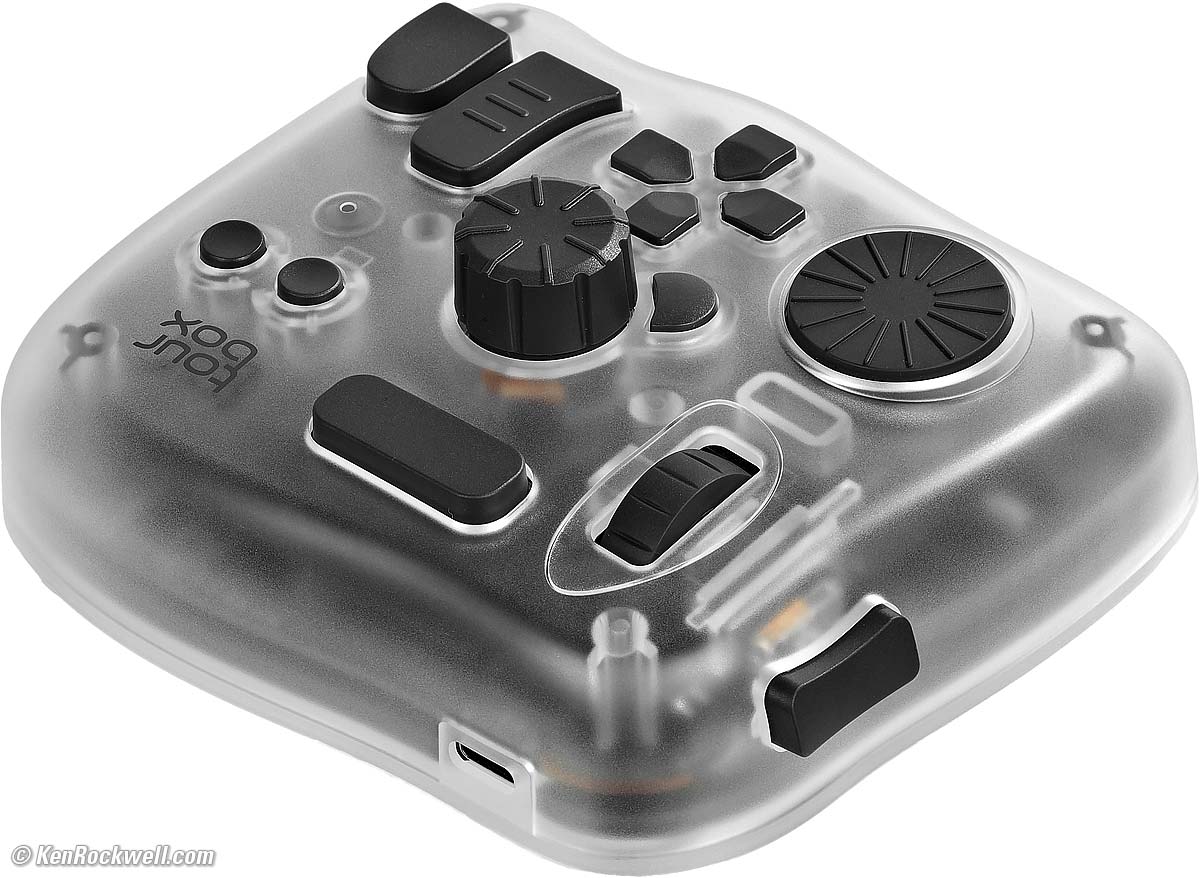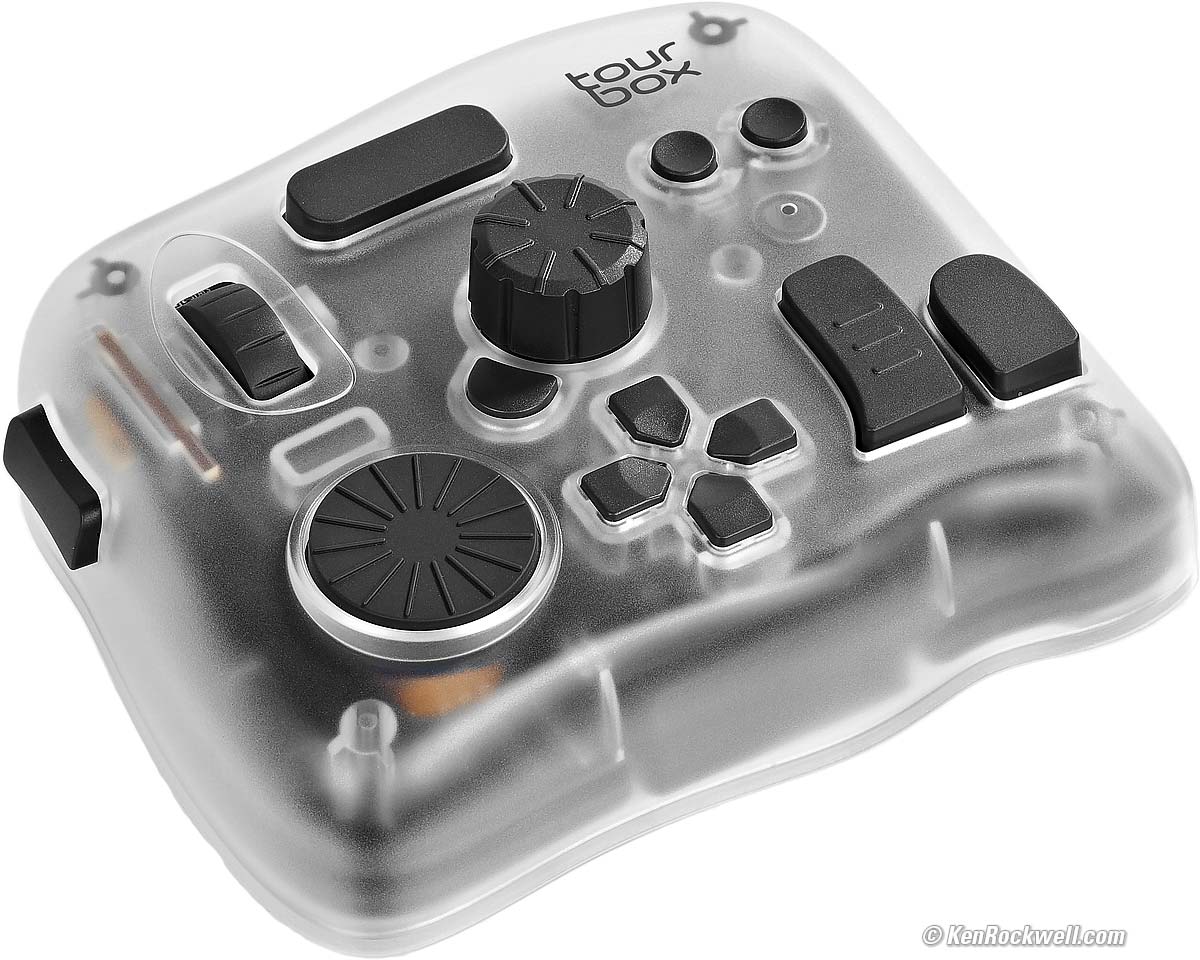 This weird looking thing is one of the most amazing computer time-savers I've ever used. It adds a fourth dimension of control and speed to everything I do on a computer. The app is so simple and well written that it makes this a complete dream.This crazy-looking thing adds a bazillion programmable knobs and dials and buttons that let me work much faster in every app on my Mac. It also works with iPad, Android and PC. It lets me work faster and get much more done in less time with far fewer keystrokes. It replaces multifinger two-hand contortions (like CTL+SHIFT+TAB to swap tabs in Safari) with just one tap or a click of a dial. It lets me use a knob to glide along timelines in video editing or scroll lists in Mail and Finder, have three separate, dedicated knobs for image zoom (with dedicated buttons for 100% and fit-to-screen), brush size and hardness in Photoshop, and do everything that used to take multiple fingers and two hands (like uploading a page SHIFT+CMD+U here in Dreamweaver as I write this) with just a single dedicated click. I even have one button programmed to SAVE AS (SHIFT+CMD+S) and then go to the end of the file name and add "-EDITED" to the file name as I save edited versions in Photoshop — all with one tap. I just sorted through 4,000 photos in Photo Mechanic, and my TourBox made it much faster using its knobs to move through images rather than clicking my arrow keys 4,000 times. My left hand spun two knobs (one for fast and one for slow running through the images) while my right hand ran my mouse, which is much faster than having to move my right hand between my mouse and the arrow keys. I program other dedicated buttons let me select my subject (OPT+CMD+W; like I can remember that?) or play a particular complex Action, like the one that resizes images to 1,200 pixels, sharpens them just how I like it, select exactly the font and dropshadows and strokes and transparencies I like to use to add ©KenRockwell.com on my images — all with just one tap in Photoshop. When you work on your Mac all day as I do, this saves me boatloads of time and I get much more done. I'm not proud; I program single keys to cut, copy and paste so I don't have to use two-finger CMD+X, CMD+C and CMD+V gyrations all day! You know how I'm a crusader for dedicated controls, and this is Heaven! While it's sold mostly for people who work in Photoshop, video editing and graphics all day, it's trivially easy to program to work with every and any app, like Mail, Finder, Photo Mechanic and Web Browsers. This system works like an immensely flexible and programmable external keyboard and mouse which can have every knob and button programmed to do pretty much anything you could do the hard way, now with one click. Each direction of each of the three knobs is programed separately. While most of us will program a knob to be opposite things like zoom-in and zoom-out, it's just as easy to program each direction to do something totally different. It’s not just about the nutty controller seen above; it’s even more about the brilliant companion TourBox Controller app that recognizes in what app I’m working and magically recalls (or lets me program settings) particular to that app: Some of the TourBox Console App (Mac). Note how it's selected Photoshop, in which I was working when I grabbed this screen. bigger. While cameras have many buttons that can be programmed, this included TourBox Console app lets me program any of its buttons and dials to do anything. Unlike cameras which offer only a small set of potential options for only some of a camera's few buttons, this app lets me program every one of its 11 dedicated buttons, every direction of all of its three dials as well as three more center-clicks in these dials, to do anything any combination of keyboard commands would do. I'm pretty good at programing macros (combinations of things that happen when you make a click) and Photoshop Actions to do all the complex things I do pretty quickly with just a few clicks and keystrokes, while this thing lets me do each with just one click! It's astonishing how it lets every possible key or dial (or any combination of keys and dials) be programmed to any combination of keyboard keystrokes or mouse actions. It has numerous options for how fast a dial responds or if it has clicks or not (or how strong), and if these actions repeat or not, or when they take affect (key up or down or...). Yes, you can program entirely different things to different combinations of controls on this box, so holding a button while spinning a knob can do something completely different than just the button or knob alone. It's super easy to get up and running and absolutely brilliant! I very quickly had it up and programed before I realized what had happened. The whole thing is completely intuitive. Some people worry about having preloaded presets in the app for certain software like DaVinci Resolve and Final Cut Pro (which it does) — but I don't. I've never been a fan of presets; instead, I simply program all the buttons as I want them as I use each program, which makes it much more intuitive. We all use each app differently so using provided presets are unlikely to be ideal for anyone. I suggest everyone program it as we use each program, including Mail and Finder and music players and it’s AWESOME! Don't be concerned if TourBox has no preset for any particular program. It comes in various versions; I got the fanciest one and use all of these controls. More basic models have fewer controls or lack Bluetooth. I'd get mine at Amazon, at B&H or at eBay (How to Win at eBay).