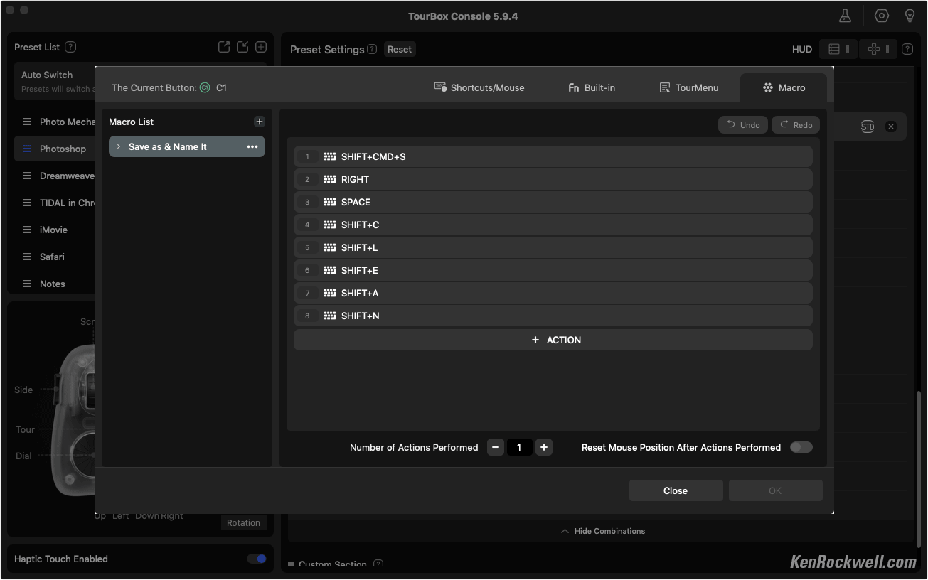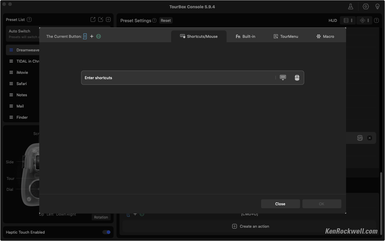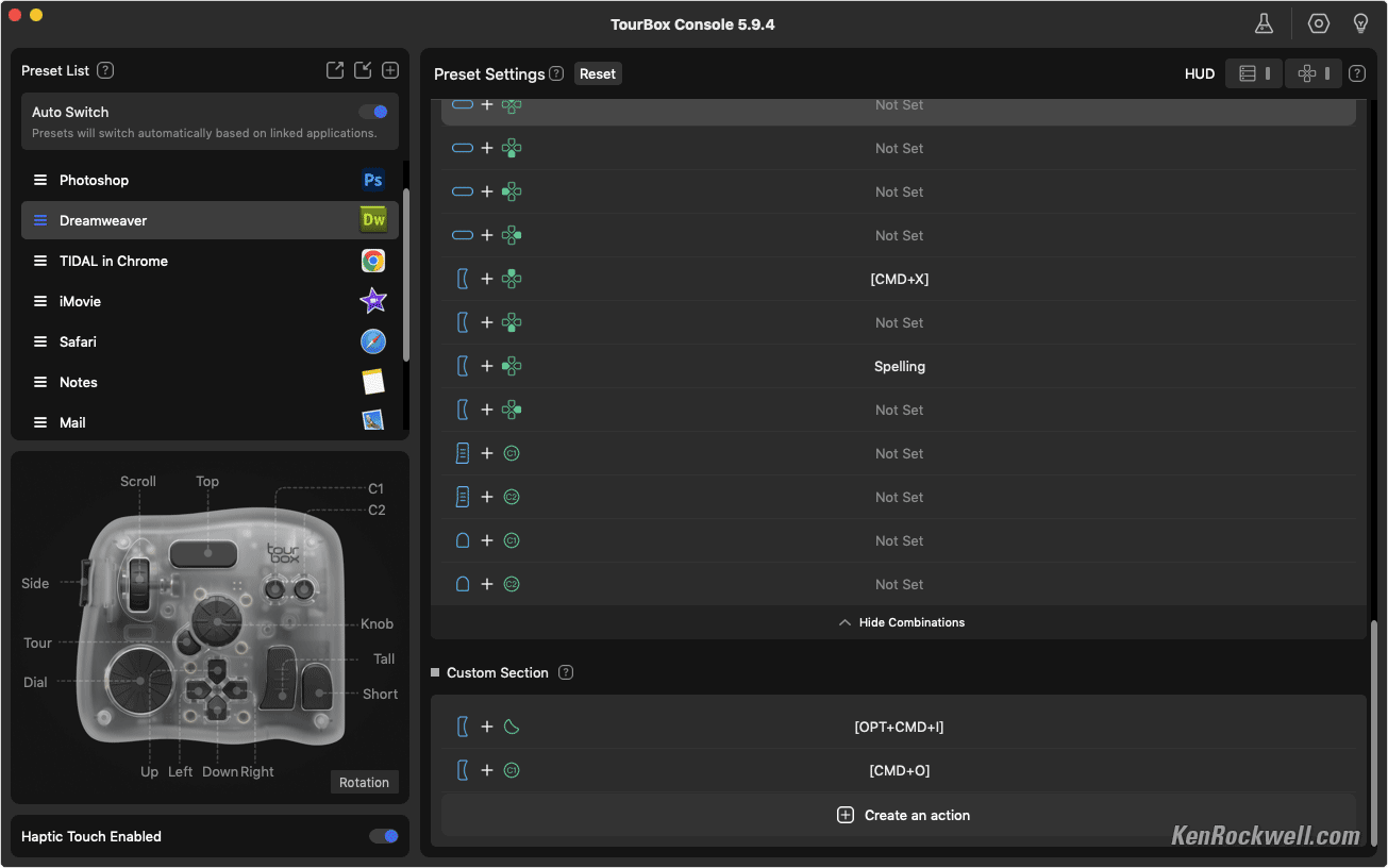This weird looking thing is one of the most amazing computer time-savers I've ever used. It adds a fourth dimension of control and speed to everything I do on a computer. The app is so simple and well written that it makes this a complete dream.This crazy-looking thing adds a bazillion programmable knobs and dials and buttons that let me work much faster in every app on my Mac. It also works with iPad, Android and PC. It lets me work faster and get much more done in less time with far fewer keystrokes. It replaces multifinger two-hand contortions (like CTL+SHIFT+TAB to swap tabs in Safari) with just one tap or a click of a dial. It lets me use a knob to glide along timelines in video editing or scroll lists in Mail and Finder, have three separate, dedicated knobs for image zoom (with dedicated buttons for 100% and fit-to-screen), brush size and hardness in Photoshop, and do everything that used to take multiple fingers and two hands (like uploading a page SHIFT+CMD+U here in Dreamweaver as I write this) with just a single dedicated click. I even have one button programmed to SAVE AS (SHIFT+CMD+S) and then go to the end of the file name and add "-EDITED" to the file name as I save edited versions in Photoshop — all with one tap. I just sorted through 4,000 photos in Photo Mechanic, and my TourBox made it much faster using its knobs to move through images rather than clicking my arrow keys 4,000 times. My left hand spun two knobs (one for fast and one for slow running through the images) while my right hand ran my mouse, which is much faster than having to move my right hand between my mouse and the arrow keys. I program other dedicated buttons let me select my subject (OPT+CMD+W; like I can remember that?) or play a particular complex Action, like the one that resizes images to 1,200 pixels, sharpens them just how I like it, select exactly the font and dropshadows and strokes and transparencies I like to use to add ©KenRockwell.com on my images — all with just one tap in Photoshop. When you work on your Mac all day as I do, this saves me boatloads of time and I get much more done. I'm not proud; I program single keys to cut, copy and paste so I don't have to use two-finger CMD+X, CMD+C and CMD+V gyrations all day! You know how I'm a crusader for dedicated controls, and this is Heaven! While it's sold mostly for people who work in Photoshop, video editing and graphics all day, it's trivially easy to program to work with every and any app, like Mail, Finder, Photo Mechanic and Web Browsers. This system works like an immensely flexible and programmable external keyboard and mouse which can have every knob and button programmed to do pretty much anything you could do the hard way, now with one click. Each direction of each of the three knobs is programed separately. While most of us will program a knob to be opposite things like zoom-in and zoom-out, it's just as easy to program each direction to do something totally different. It’s not just about the nutty controller seen above; it’s even more about the brilliant companion TourBox Controller app that recognizes in what app I’m working and magically recalls (or lets me program settings) particular to that app: Some of the TourBox Console App (Mac). Note how it's selected Photoshop, in which I was working when I grabbed this screen. bigger. While cameras have many buttons that can be programmed, this included TourBox Console app lets me program any of its buttons and dials to do anything. Unlike cameras which offer only a small set of potential options for only some of a camera's few buttons, this app lets me program every one of its 11 dedicated buttons, every direction of all of its three dials as well as three more center-clicks in these dials, to do anything any combination of keyboard commands would do. I'm pretty good at programing macros (combinations of things that happen when you make a click) and Photoshop Actions to do all the complex things I do pretty quickly with just a few clicks and keystrokes, while this thing lets me do each with just one click! It's astonishing how it lets every possible key or dial (or any combination of keys and dials) be programmed to any combination of keyboard keystrokes or mouse actions. It has numerous options for how fast a dial responds or if it has clicks or not (or how strong), and if these actions repeat or not, or when they take affect (key up or down or...). Yes, you can program entirely different things to different combinations of controls on this box, so holding a button while spinning a knob can do something completely different than just the button or knob alone. It's super easy to get up and running and absolutely brilliant! I very quickly had it up and programed before I realized what had happened. The whole thing is completely intuitive. Some people worry about having preloaded presets in the app for certain software like DaVinci Resolve and Final Cut Pro (which it does) — but I don't. I've never been a fan of presets; instead, I simply program all the buttons as I want them as I use each program, which makes it much more intuitive. We all use each app differently so using provided presets are unlikely to be ideal for anyone. I suggest everyone program it as we use each program, including Mail and Finder and music players and it’s AWESOME! Don't be concerned if TourBox has no preset for any particular program. It comes in various versions; I got the fanciest one and use all of these controls. More basic models have fewer controls or lack Bluetooth. I'd get mine at Amazon, at B&H or at eBay (How to Win at eBay).