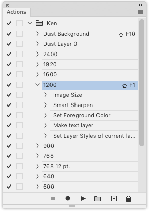Photoshop ActionsActions are ways to program Photoshop to run sets of commands with one click. Every photo you see on this website comes from the action I wrote 20 years ago that resizes the image to 1,200 pixels, sharpens it to taste and adds "© KenRockwell.com" in exactly the font I want with exactly the dropshadows and strokes I defined decades ago. Once programed, it's not really just one click. You have to mouse over to and select which action to run in the Actions palette: An Actions Palette. and then find and click the play button at the center bottom. When you do as much Photoshop work as I do, this is quite lot of mousing around which we now can accomplish with a single click on the TourBox. It’s easy to program TourBox buttons to run any particular Action in Photoshop, but few people know the steps involved. It’s amazing to have my complex actions just go with one tap. To program Actions in Photoshop, go to Photoshop > Windows (or use OPT+F9) to turn on the Actions Palette as seen above. In this palette you can create and record actions. Hit the menu bars icon on the top right, select New Action and have at it. Once you have some actions programmed in Photoshop, you need to assign keyboard shortcuts to them so you can run them from single clicks on the TourBox. Do this by double-clicking to the right of any action, which calls up this window: Action Options. Select an Fn key in this window to run this Action. Hint: Most of us already have the "good" Fn keys assigned, so use nutty Fn keys like F19, or better, use combinations adding the SHIFT and/or COMMAND keys. Once set, these assigned Fn keys also appear in the Actions Palette and you can program keys or dials of the TourBox to these Fn keys and combinations. It sounds complex, and when you knock this out, I save hours and hours not having to resize and process ever intimate detail of my images manually.