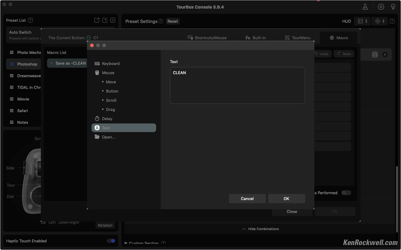 MacrosTo program a button to play a macro (a series of programmed clicks or other actions), click the Macro option towards the top right in the screen you get when you click to program any particular control: Macros (Click top left MACROS Tab, Mac). bigger. Click + ACTION to add each step. This macro for Photoshop saves my edits as a new file with "CLEAN" added at the end of the file name. I added each letter as a new Keyboard action (option at the center bottom) for each letter. This was the hard way to add text which I did the first day I had my TourBox. The next day I noticed the Text option after clicking the + ACTION option to let me just add text the easy way: Direct Text Option in Macros (seen after clicking +ACTION). bigger. The great news is this is all super intuitive; just play with the program, keep looking around and you're good.
