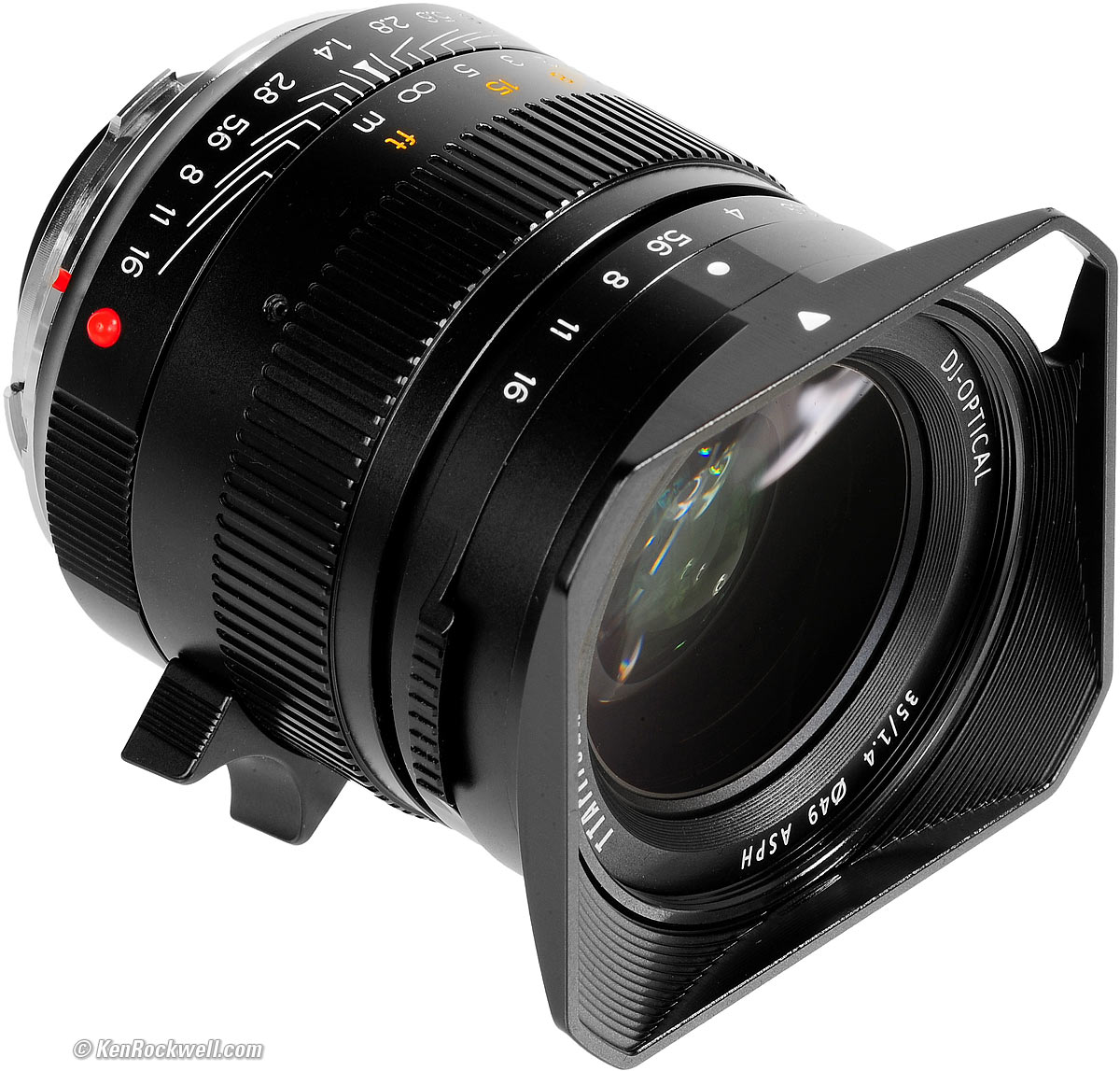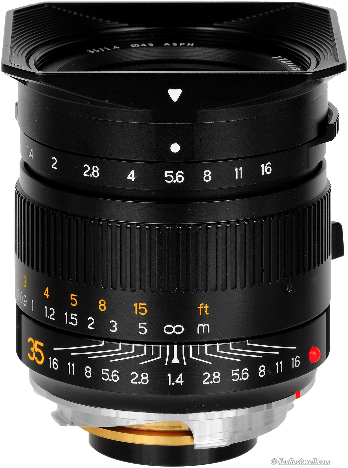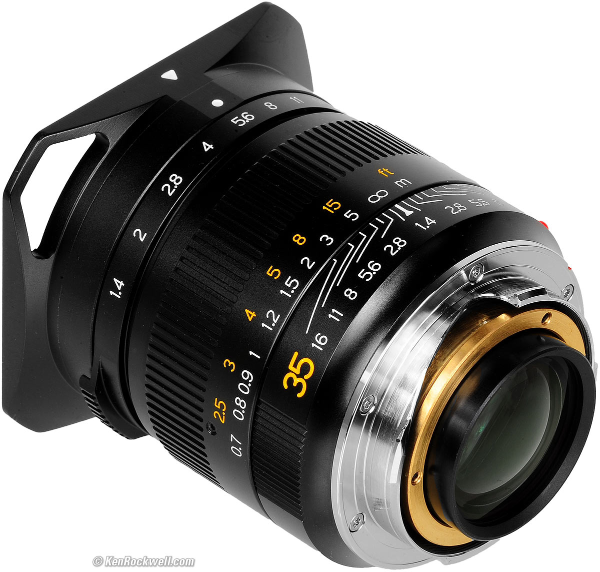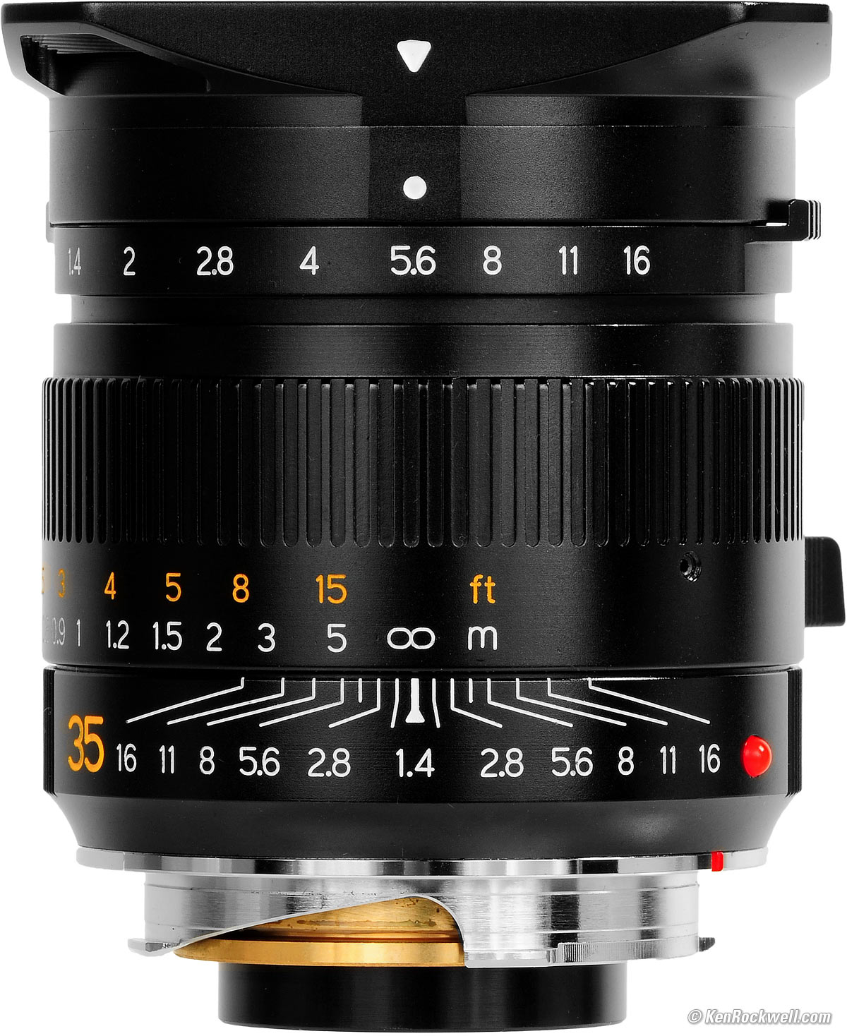 All lenses should be this good. There are only two controls: silky-smooth focus and the aperture ring. The aperture ring feels just like those on my LEICA lenses, bravo! Oddly the aperture ring is so thin that it offers no grip or ribbing, and instead has but two small focus tabs. Instead of being able to move the aperture from any position along the ring as with my LEICA SUMMMILUX-M 35mm f/1.4 ASPH FLE (2010 ~ today) and LEICA SUMMMILUX-M 35mm f/1.4 ASPH (1994 ~ 2010), it only has tabs like my LEICA SUMMILUX 35mm f/1.4 (1960 ~ 1995). Focus is either with two fingers on the ring for precise setting (something that no LEICA 35mm f/1.4 offers), or with one finger on the solid alloy focus tab for fast work. Designed and built in China, the focus tab is slightly small for American fingers. Its inside radius is slightly tighter than LEICA's, which is only apparent if you also have the real LEICA lenses and notice that there is more room for a full-sized finger in the LEICA focus tabs. The red mounting-index ball is visible in low light, and easy to feel in total darkness. Every lens should be be like this, but too many others hide the index marks or don't make them feelable, as if they're deliberately trying to hide these very important marks. Bravo!