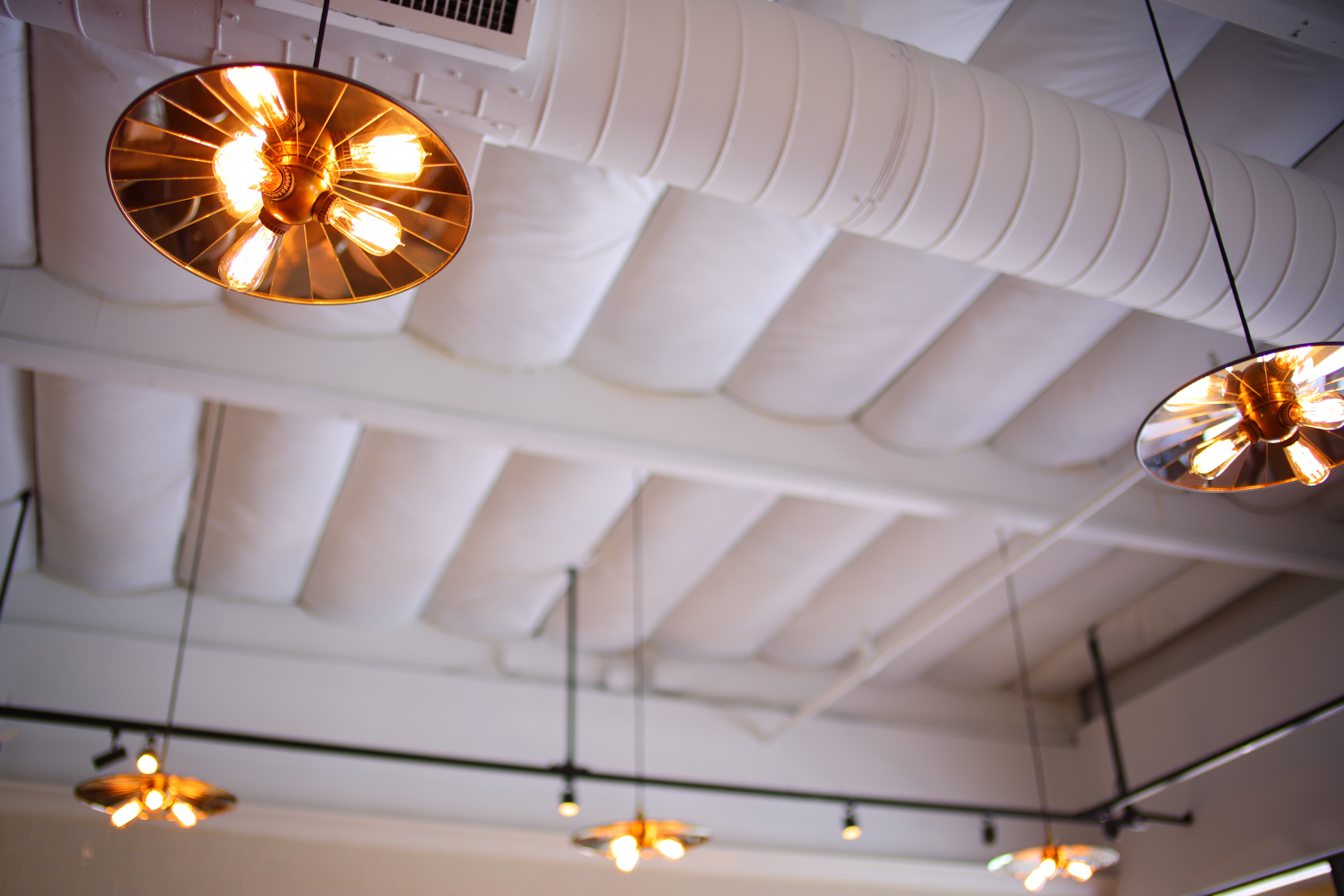 Ceiling Lamps, 12:02 PM, 16 August 2021. Canon R5, TTArtisan 35mm f/1.4 ASPH on basic mechanical adapter at f/1.4 at 1/40 at Auto ISO 100, Perfectly Clear. bigger or camera-original © NORMAL JPG file. Only part of the light on the top left is in focus. This is more a study in bokeh than sharpness.