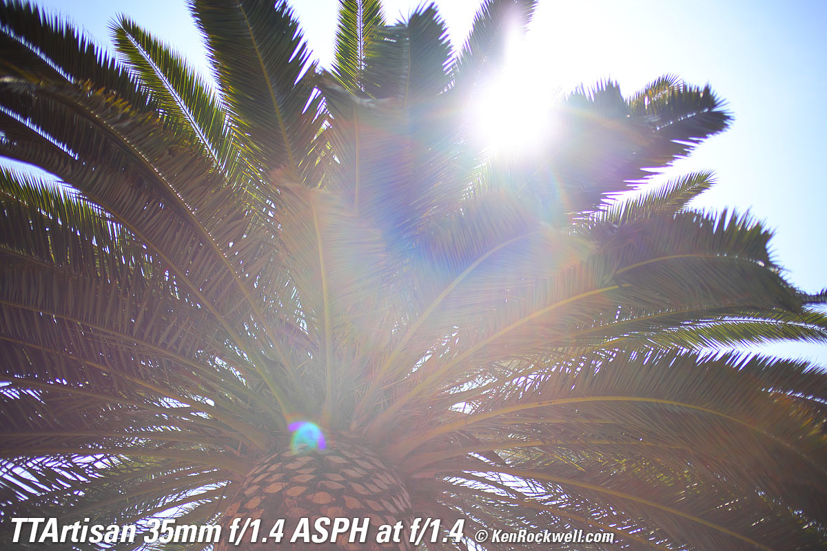 Flare & Ghosts performance topThis lens' coating aren't quite up to the standard of better lenses and there is a bit more flare than in other lenses. It's worst wide-open at f/1.4. I'm exaggerating the flare in these extreme examples. Click any to enlarge: Click any to enlarge. More examples at Sunstars.
