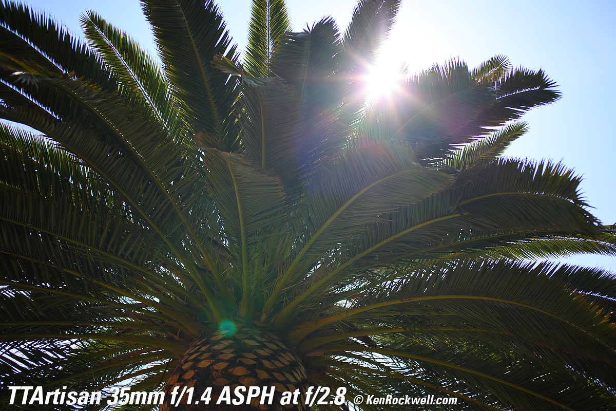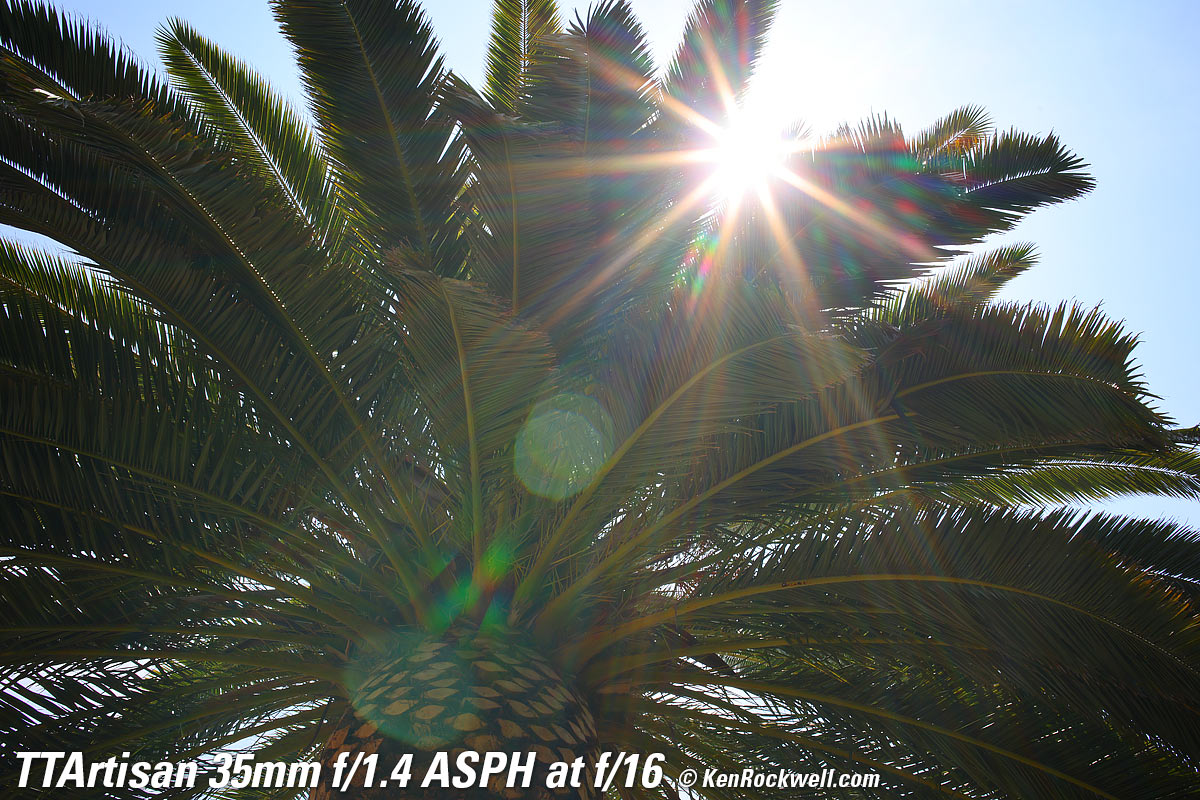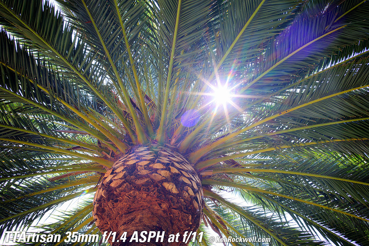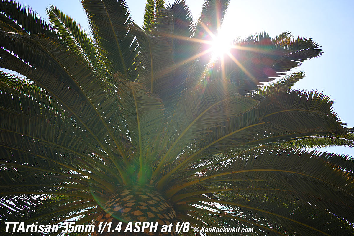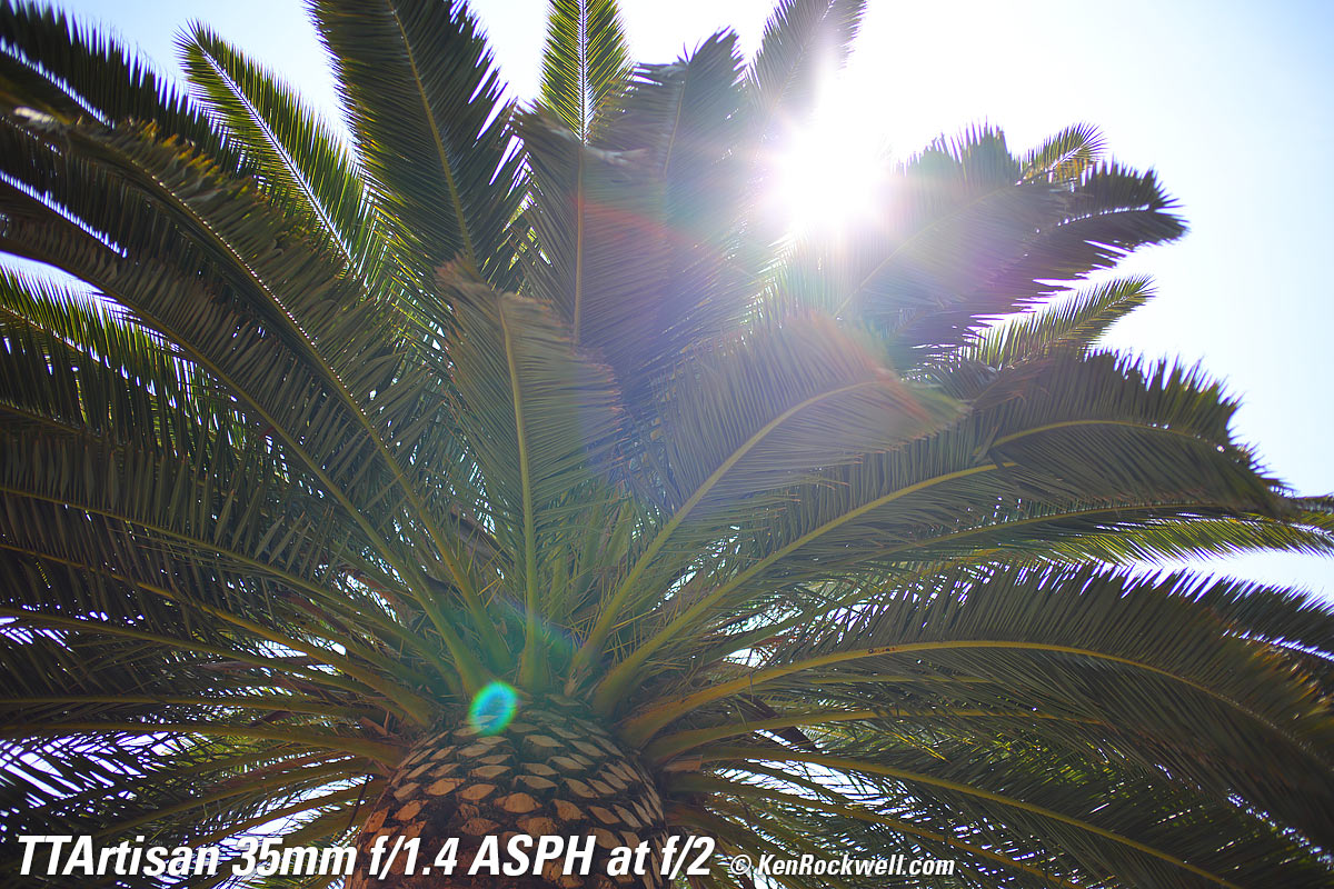 At f/1.4Canary Palm, 1:22 PM, 16 August 2021. Canon R5, TTArtisan 35mm f/1.4 ASPH on basic mechanical adapter at f/1.4 at 1/800 at Auto ISO 100, +0.7 stops exposure compensation, Perfectly Clear. bigger, full resolution or camera-original © NORMAL JPG file. Very little of this is in focus. Don't confuse lack of depth-of-field at f/1.4 with lens softness. The only part in focus is just some of the central ball of the palm.