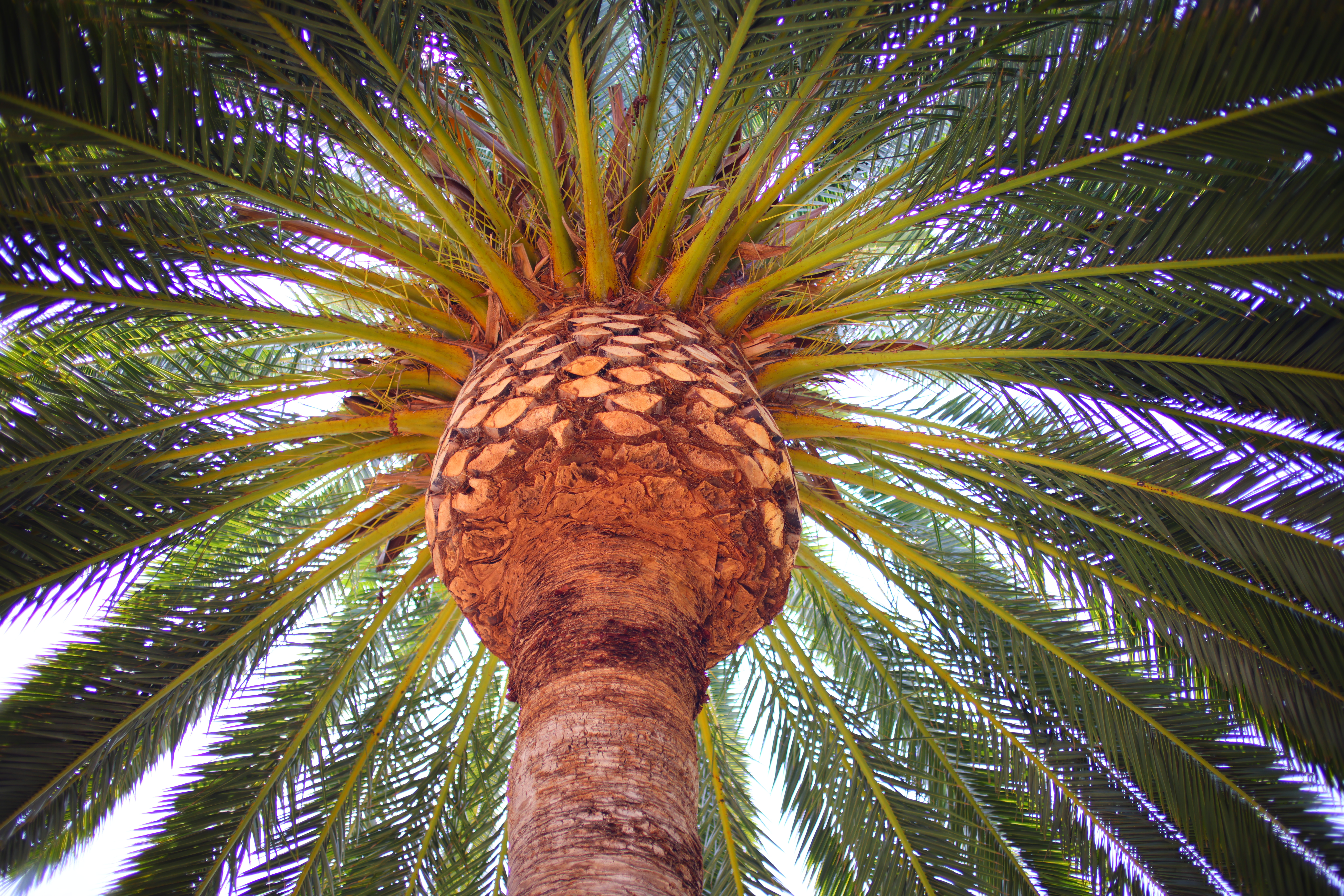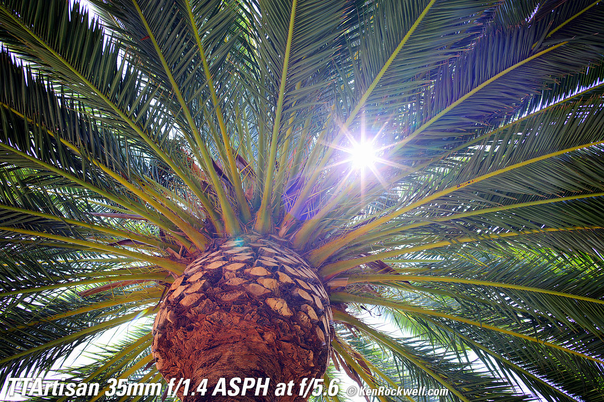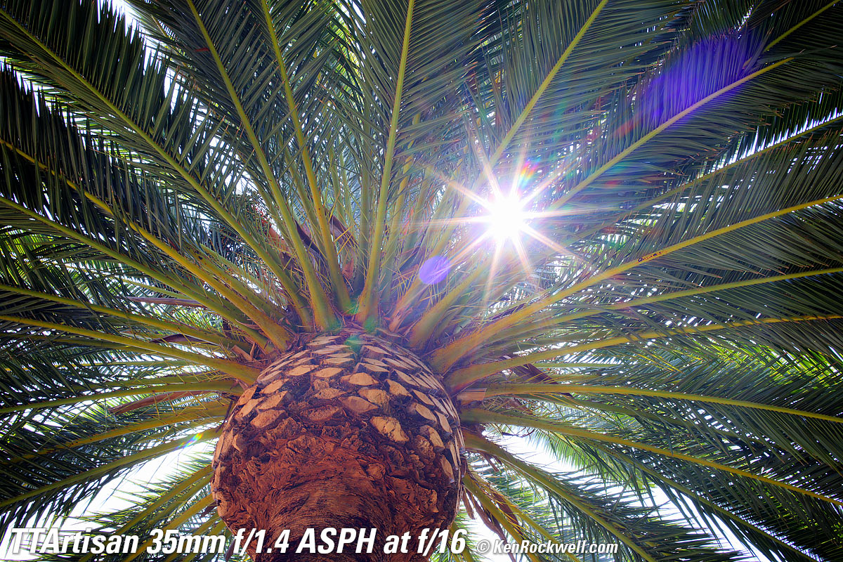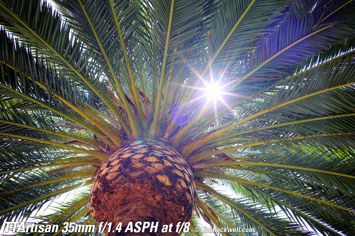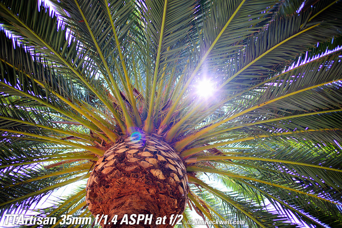 At f/1.4Canary Palm, 1:22 PM, 16 August 2021. Canon R5, TTArtisan 35mm f/1.4 ASPH on basic mechanical adapter at f/1.4 at 1/800 at Auto ISO 100, +0.7 stops exposure compensation, Perfectly Clear. bigger, full resolution or camera-original © NORMAL JPG file. Very little of this is in focus. Don't confuse lack of depth-of-field at f/1.4 with lens softness. The only part in focus is just some of the central ball of the palm.
