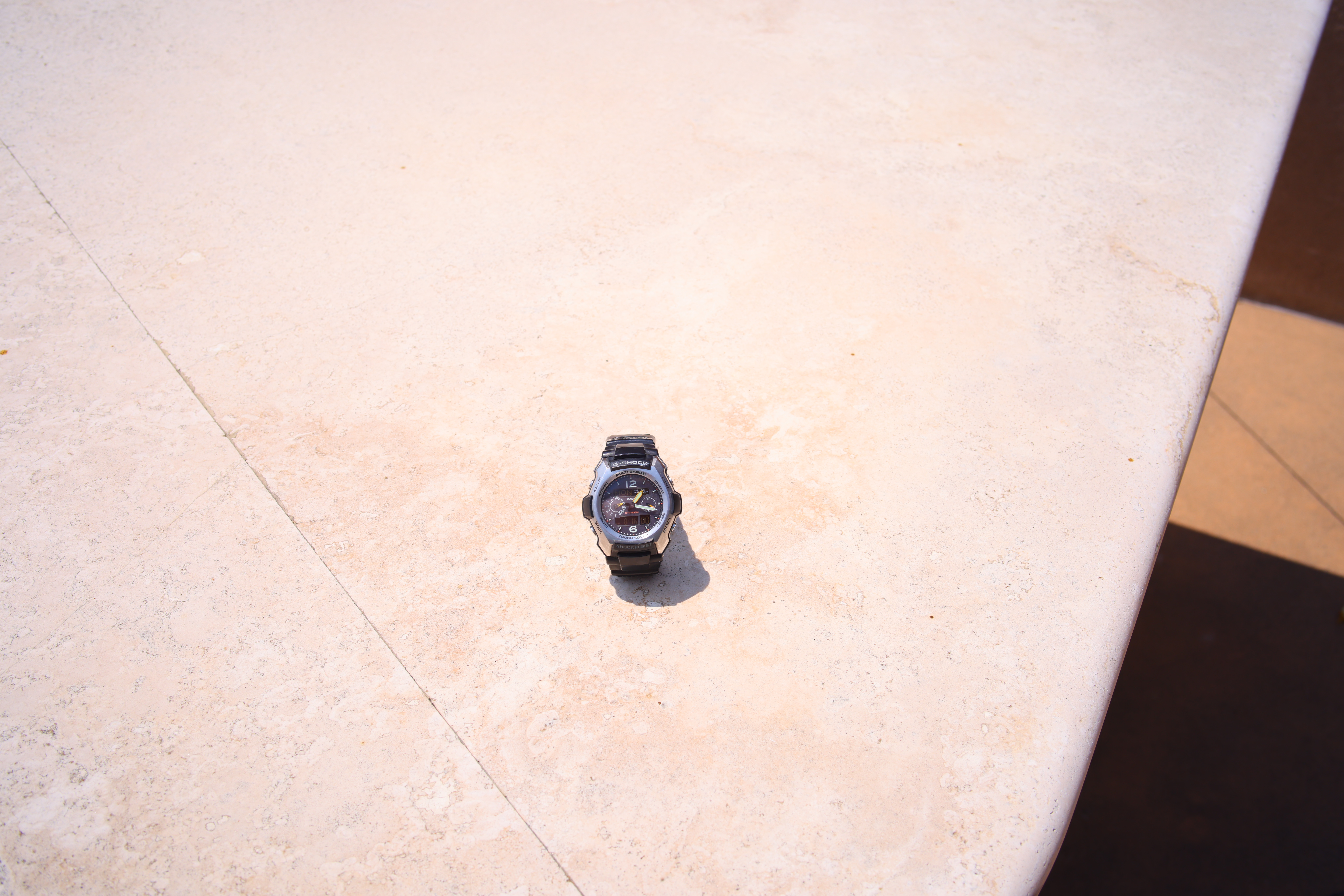 At f/8Casio G-Shock Solar Atomic Watch at close-focus distance, 16 August 2021. Canon R5, TTArtisan 35mm f/1.4 ASPH on basic mechanical adapter at f/8 at 1/320 at Auto ISO 100, +2.3 stops exposure compensation, Perfectly Clear. bigger or camera-original © NORMAL JPG file.