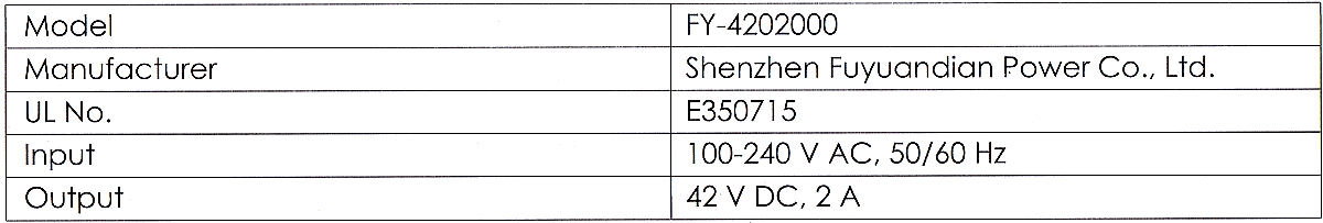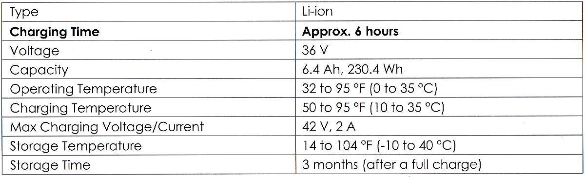 BatteryLi-Ion. 36 V. 6.4 Ah. 230 WH. Charge: 42V at 2 A.