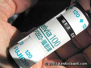 Ken's Tests I have used Velvia (RVP, ISO 50) since 1990 and use it for almost everything. I love it. I tried Velvia 100F (RVP F) in June 2003 and seen other samples of it. I don't like it. The colors on Velvia 100F (RVP F) are dull compared to Velvia (RVP), and the warm colors are cooler. As you ought to know I don't care about grain or speed, and I care deeply about vivid color. The colors were not as wild as the Velvia I love. Velvia has the warm reds and yellows I need, and the Velvia 100F had pale, lame colors by direct comparison. A distortion I LOVE in Velvia is that it tends to make warm colors warmer. In other words, something lit by orange sunset light will tend to get even warmer, which is very important to me. From what the engineers at Fuji told me, and a few shots on the one roll I had, it looks like Velvia 100F unfortunately removes this pleasant distortion. If this is true then Velvia will remain my preference, and the best film for shooting landscapes during magic hour. I also love the wild colors that artificial light turns on most films. Velvia 100F is designed to minimize this with extra color layers; I usually prefer the exaggerations of Velvia. Ken's information from Fuji and the examples Kenji, one of the inventors of Velvia, showed him at PMA 2003 I sat with some of Fuji's people from Japan for a half hour at PMA in March 2003 previewing the new films. My biggest concern is the availability of Velvia which has been the basis of my work since the late 1980s. I was told directly that Velvia will remain available. Fuji tells me directly that of course they are not discontinuing Velvia, although some less-reputable retailers have spread rumors presumably to get you to buy lots of Velvia today. From what I saw I prefer the Velvia I have been using. Velvia 100F is claimed to have more accurate colors, which I don't want. I love the wild (inaccurate) colors I get, which I prefer to reality. Velvia tends to render yellows more warm than they actually are, which I love. New Velvia 100F has extra color layers which will tend to lesson the green cast under fluorescent light, although I sometimes deliberately employ this shift for artistic effect. Velvia 100F seemed to be a little cooler. I love warm. Velvia 100F seemed to have better ability to render differences between colors in some flowers, but since I had no reference to the original subject it's hard for me to say. Greens seem to be even more vivid on Velvia 100F, an advantage. What about the test in Pop Photo? The July (I think) 2003 issue had a test. It was all wrong. The usually clever writers did a totally bone-headed thing, and tested the films not for doing what Velvia does best (which is the professional standard for nature, daylight action sports and landscapes) and instead tested it for what Velvia is awful, which is photos of people and under artificial light. Of course Velvia 100F was better, since Velvia is one of the worst films for people photos and Velvia 100F was specifically designed to fix this. Unfortunately this test shot nothing for landscapes during magic hour, so the test is misleading and therefore worse than useless. Even worse, the Pop Photo review said two infuriating things: 1.) That some unnamed source said Velvia was going away. That would be very stupid, just like when Kodak's boneheads discontinued Tri-X, and 2.) Pop Photo alluded to the Velvia 100 we really need, which is the more saturated Velvia 100 (not 100F) available only in the Orient. I looked into it and discovered the film we really need is called Velvia 100 Daylight in Japan, different from the dull Velvia 100F. I did some investigation and just got some to try. Readers Write: Turgut