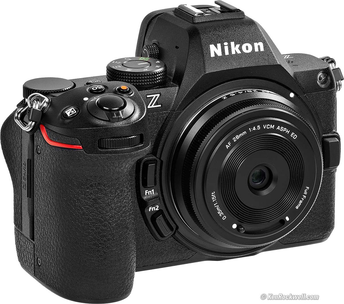 This tiny thing is about the size of a lens cap. It easily fits my jeans' watch pocket, which is the little pocket on the front right designed to hold a pocket watch back in 1871 when jeans were invented. For $99 this tough, mostly metal lens has autofocus and an internal lens cover, and makes fine images as you've just seen. Its rendition or optical signature is some falloff typical of wide non-SLR lenses. This is is good because it helps emphasize the subject and saves me from having to add vignetting later in Skylum Luminar Neo. Ansel Adams added this with edge burning while printing for exactly the same reason. This lens possesses what we artists call Rembrandt rendition: darker and softer edges all around to keep your patron's attention focused inside your image and not wandering off the edges to something else, like rubbish snapped on a LEICA M. While autofocus works great and its optics are swell, its aperture is fixed at f/4.5 so it can't be used where we need smaller apertures, like with fill flash outdoors or for landscapes that need deeper depth-of field. There also is no way to focus it manually and no threads for filters. It's too small for manual focus or filter rings! How tiny is it? Here is it on my Nikon Z5 II. See the silver ring at the base of the lens? This is a part of my Nikon Z5 II, not a part of the lens. The lens stops at the black section engraved AF 28/4.5 Z: Tiny Viltrox AF 28mm f/4.5 on Nikon Z5 II. bigger. For Nikon Z: I got mine directly from Viltrox (try coupon code KENROCKWELL at checkout possibly for an 8% discount). I'd also get it at B&H, at Amazon, at eBay (How to Win at eBay), or get it used at KEH. For Sony: I'd get mine directly from Viltrox (try coupon code KENROCKWELL at checkout possibly for an 8% discount). I'd also get it at B&H, at Adorama, at Amazon, at eBay (How to Win at eBay), or get it used at KEH. For Fuji: I'd get mine directly from Viltrox (try coupon code KENROCKWELL at checkout possibly for an 8% discount). I'd also get it at B&H, at Adorama, at Amazon, at eBay (How to Win at eBay), or get it used at KEH.