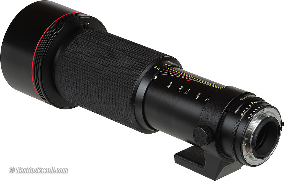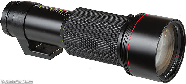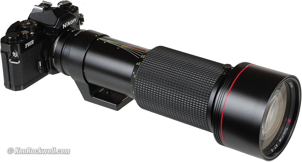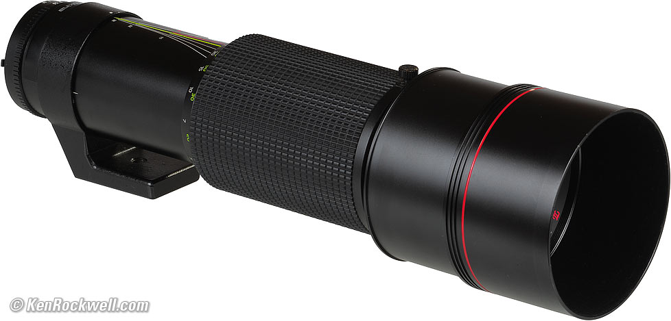 This is an unusual manual focus lens. It works on almost all Nikons (see Nikon Lens Compatibility and read down the AI, AI-s column), but the Canon FD version only works on old Canon manual focus cameras. The Canon version will not work on any Canon EOS or digital camera, but works great on cameras like the T90, T70, F-1n and AE-1. For autofocus cameras, I prefer my Nikon 200-500mm VR or my Canon 100-400mm L IS II, since they both autofocus and add image stabilization. 500mm versus 400mm isn't worth the loss of AF and VR, if you're shooting a modern camera, while the new lenses focus much closer. For manual focus cameras, this is a unique lens not offered by Canon or Nikon. Its extremely low distortion may make it a winner for those who need it. This all-content, junk-free website's biggest source of support is when you use those or any of these links to approved sources when you get anything, regardless of the country in which you live. Never buy at retail or any other source not on my personally approved list since you'll have no way of knowing if you're missing accessories, getting a defective, damaged, returned, store demo or used camera. I use the stores I do because they ship from secure remote warehouses where no one gets to touch your new camera before you do. Buy only from the approved sources I use myself for the best prices, service, return policies and selection. Thanks for helping me help you! Ken, Mrs. Rockwell, Ryan and Katie.