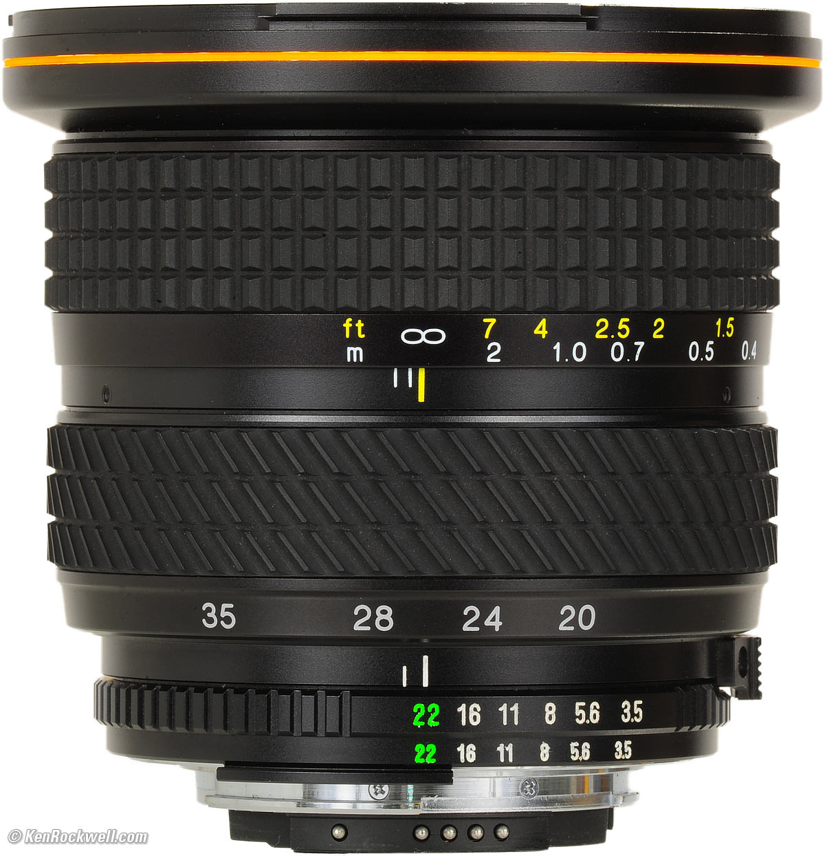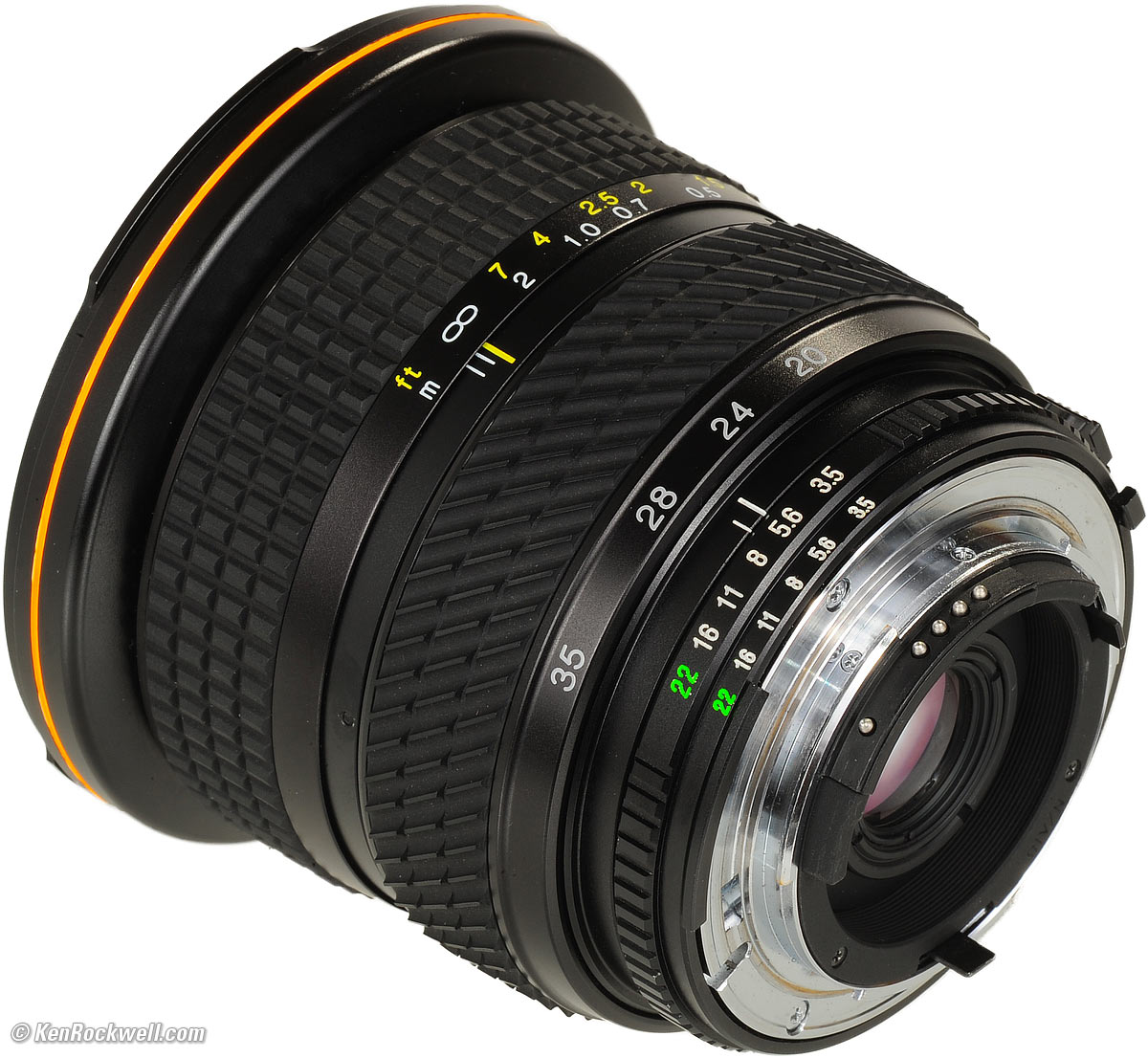 Home Donate New Search Gallery How-To Books Links Workshops About Contact Tokina 20-35mm f/3.5-4.5 Intro Specs Performance Compared Recommendations Tokina 20-35mm f/3.5-4.5, Nikon version (72mm filters, 17.8 oz./504g, 1.7'/0.4m close focus, about $100 used). enlarge. The biggest source of support for this free website is when you use these links, especially this direct link to this lens at eBay (see How to Win at eBay), or at Adorama, when you get anything, regardless of the country in which you live. Thanks! Ken.