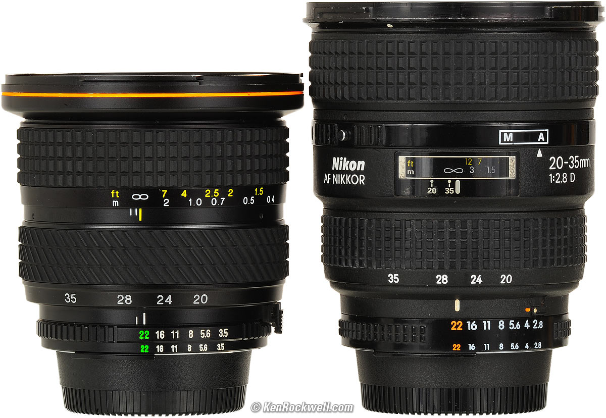 Compared top Intro Specs Performance Compared Recommendations Tokina 20-35/3.5-4.5 and Nikon 20-35mm f/2.8 AF-D. enlarge. I compared this Tokina directly to the Nikon 20-35mm f/2.8 AF-D, Nikon 17-35mm f/2.8 AF-S and Nikon 18-35mm f/3.5-4.5 on a Nikon D3. This Tokina lens is as good optically as these Nikon professional zooms. The Nikon 17-35mm f/2.8 AF-S is a bit better, while this Tokina is superior to Nikon's 20-35mm f/2.8 AF-D! This Tokina's optics are about as good as Nikon's 18-35mm f/3.5-4.5, while this Tokina has far superior mechaics to the plastic Nikon 18-35mm. None of these zooms are very sharp on the sides and corners. They are all pretty good in the center. These comparisons are looking mostly in the corners, where the differences are most apparent: At 20mm and f/4, they are about the same, with the Nikon 20-35mm f/2.8 AF-D worse than the other three. At 20mm and f/8, the Nikon 17-35mm f/2.8 AF-S is a bit better than the other three. At 35mm and f/4 or f/4.5, the Nikon 17-35mm f/2.8 AF-S is best, this Tokina 20-35 is second, the Nikon 18-35mm f/3.5-4.5 is second worst and the Nikon 20-35mm f/2.8 AF-D is the worst. At 35mm and f/8, the Nikon 20-35mm f/2.8 AF-D, Nikon 17-35mm f/2.8 AF-S are best and the Nikon 18-35mm f/3.5-4.5 and this Tokina are worse. Therefore, this inexpensive Tokina slots right in there between Nikon's lenses. The 17-35mm AF-S is a much newer and more expensive lens, while this Tokina is just as good optically as Nikon's current plastic 18-35mm f/3.5-4.5, and this Tokina is much better than Nikon's original Nikon 20-35mm f/2.8 AF-D. I didn't compare Tokina's f/2.8 20-35mm AT-X here, but when I did before, the Tokina 20-35mm f/2.8 was inferior optically to the Nikon lenses. Therefore, transposition tells us that this inexpensive Tokina lens is much better than Tokina's much more expensive f/2.8 lens that was sold alongside this lens. I didn't bother comparing the Nikon 16-35mm VR optically because I've already shown that its the sharpest ultrawide zoom on the planet. All these other lenses are previous generation. If you count your pixels, get the 16-35mm VR.
