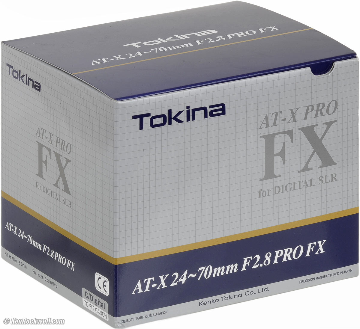Home Donate New Search Gallery Reviews How-To Books Links Workshops About Contact Tokina 24-70mm f/2.8 Sample Images Intro Specs Performance Compared Usage Recommendations More Tokina AT-X 24-70mm f/2.8 PRO FX (in Canon mount, also comes in Nikon mount; full-frame, APS-C and 35mm film coverage, 82mm filters, 35.8 oz./1,016g, 1.3'/15"/0.38m close focus, about $999). enlarge. I got mine at Adorama; I'd also get it at Amazon or at B&H. This all-content, junk-free website's biggest source of support is when you use those or any of these links to approved sources when you get anything, regardless of the country in which you live. Tokina's boxes are not sealed in any way, so never buy at retail or any source not on my personally approved list since you'll have no way of knowing if you're missing accessories, getting a defective, store demo, damaged, dropped, returned or used lens. My approved sources ship from remote automated warehouses where no one gets their greasy fingers on your new lens before you do. Buy only from the approved sources I use myself for the best prices, service, return policies and selection. Thanks for helping me help you! Ken.