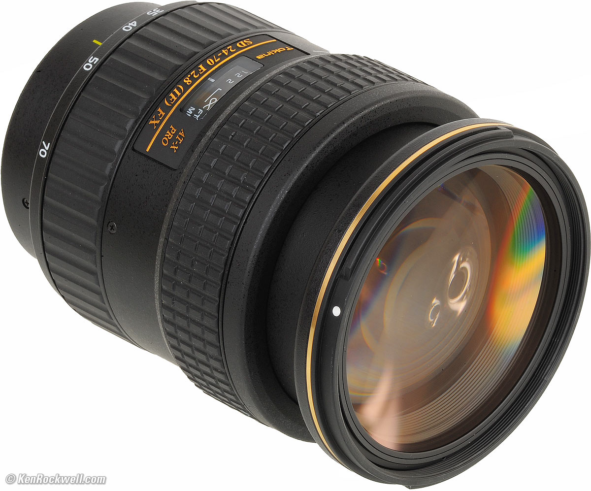 Tokina 24-70mm f/2.8 Construction. 15 elements in 11 groups. Three glass molded aspherical elements. Three ED (a.k.a. UD or SD) glass elements. Internal focus: nothing moves externally as autofocused. Pumper zoom, grows as zoomed towards 70mm. Multicoated.