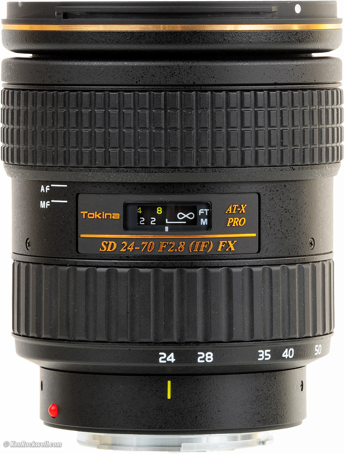 Tokina 24-70/2.8. bigger. Name Kenko Tokina calls this the Tokina AT-X 24-70mm f/2.8 PRO FX (IF) SD. AT-X: Advanced Technology-seX. PRO: Push-pull mechanical clutch mechanism on the focus ring to swap between auto and manual focus. FX: Covers all 35mm-based "full frame" and smaller digital formats. IF: Internal focus; nothing moves externally as focussed. SD: Super-low Dispersion glass for less secondary chromatic aberration.