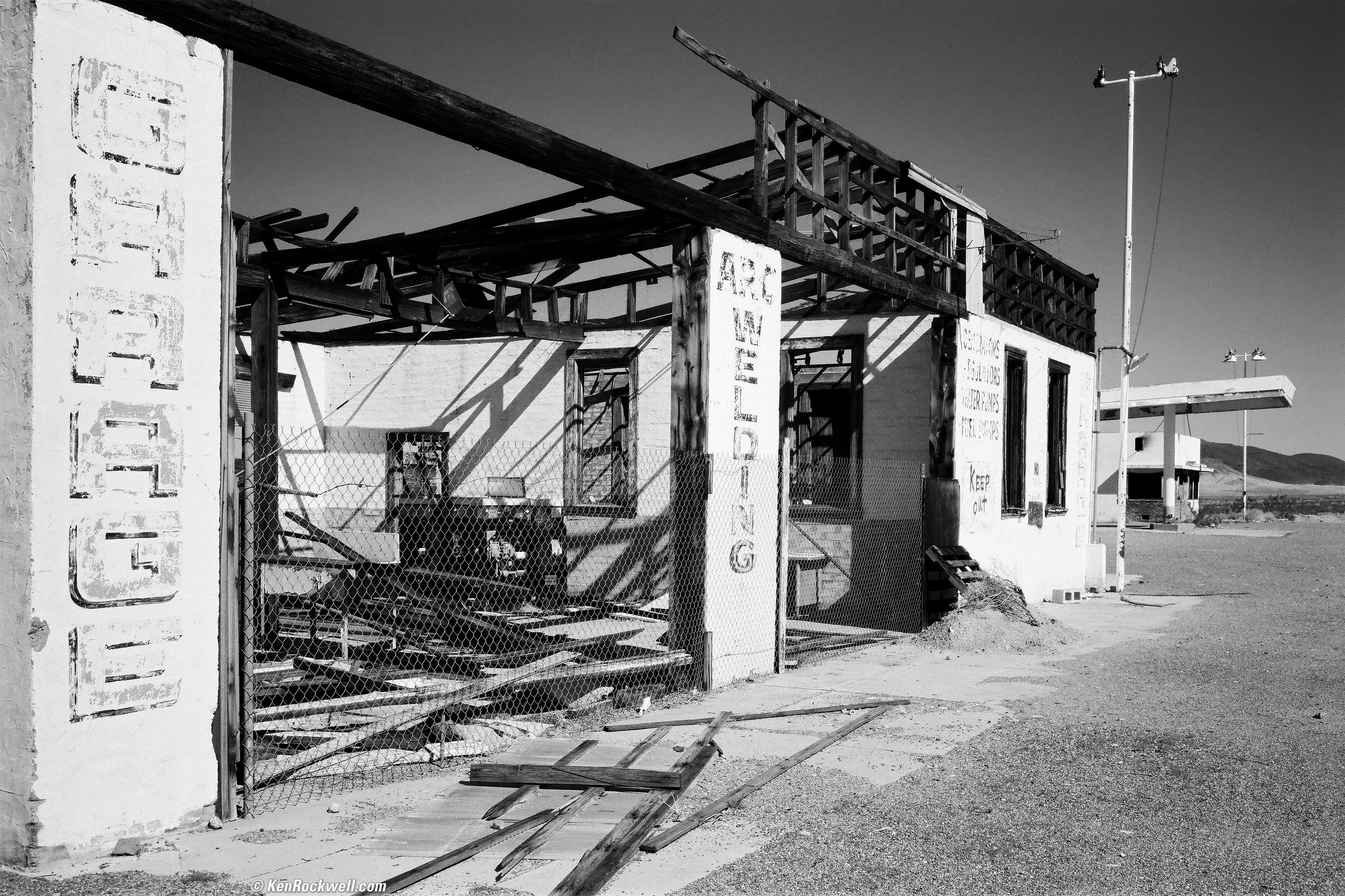 RUIN, PRIVATE PROPERTY, NEWBURY SPRINGS. (Velvia 50, B+W MRC 39mm 81A filter, 1959 21mm f/4 LEITZ SUPER-ANGULON, 1963 LEICA M3, NCPS scan.) Will miracles never cease? This is frame thirty-nine on that same 36-exposure roll!