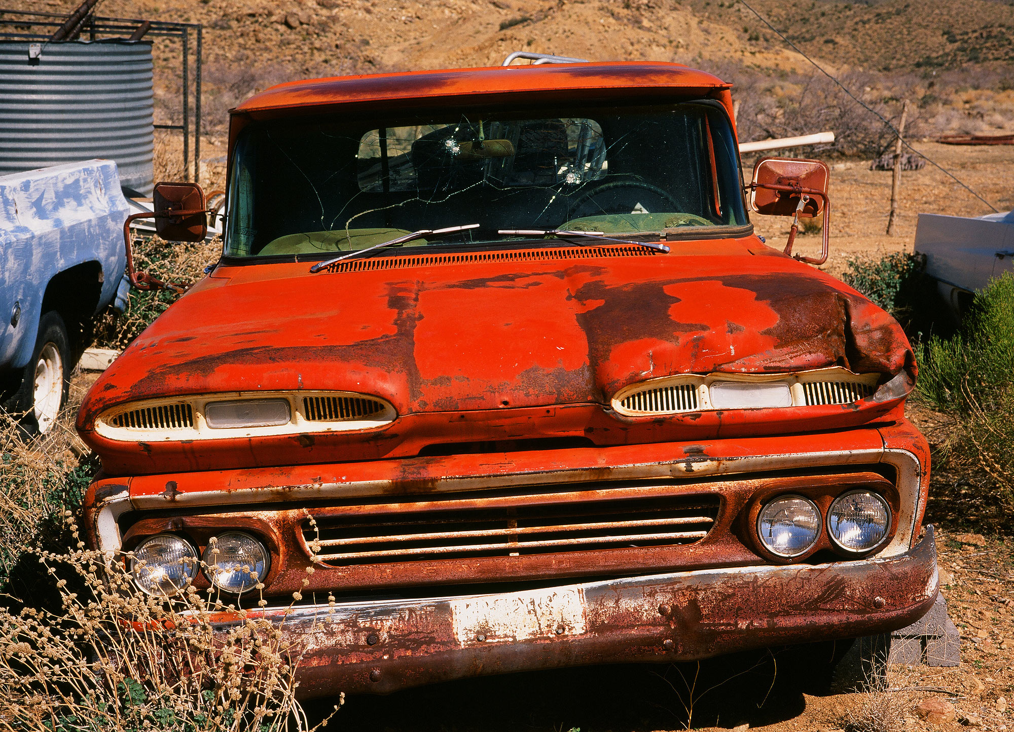 RED TRUCK, HACKBERRY. (Velvia 50, 39mm LEITZ CF (A3 warming) filter, 1957 50mm f/2 LEICA SUMMICRON with near-focusing range, 1963 LEICA M3, 1950s selenium LEICAMETER MC light meter, NCPS scan.) enlargement. Is this 1957 lens sharp enough for you, from windshield to bumper?