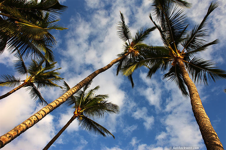 Palms, Mana Kai, Kihei, Maui. 5:41 PM. Canon 5D Mark II, ISO 50, Canon 28mm f/1.8, Professional exposure (P) mode chose f/10 at 1/100, no flash, -2/3 exposure compensation. This shot would have been much better as the sun went down, but tough. I lightened all of it, I then lightened the palm fronds using a curves adjustment layer mask, and I didn't lighten the trunk that comes in from the lower left since it was pretty hot (bright) at the start. To see the image as shot, roll your mouse over the image.