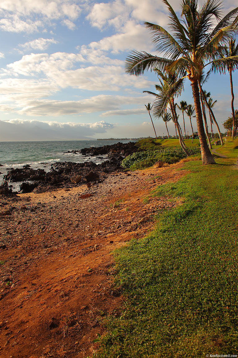 Mana Kai, Kihei, Maui. 5:45 PM. Canon 5D Mark II, ISO 50, Canon 28mm f/1.8, shifted Professional exposure (P) mode chose f/10 at 1/125, no flash, -2/3 exposure compensation. This shot again would have been a zillion times better as the sun went down, but tough again. I lightened the palm fronds using a curves adjustment layer mask, and I also lightened some of the ground to try to add some sort of interest in this mediocre light. To see the image as shot, roll your mouse over the image.