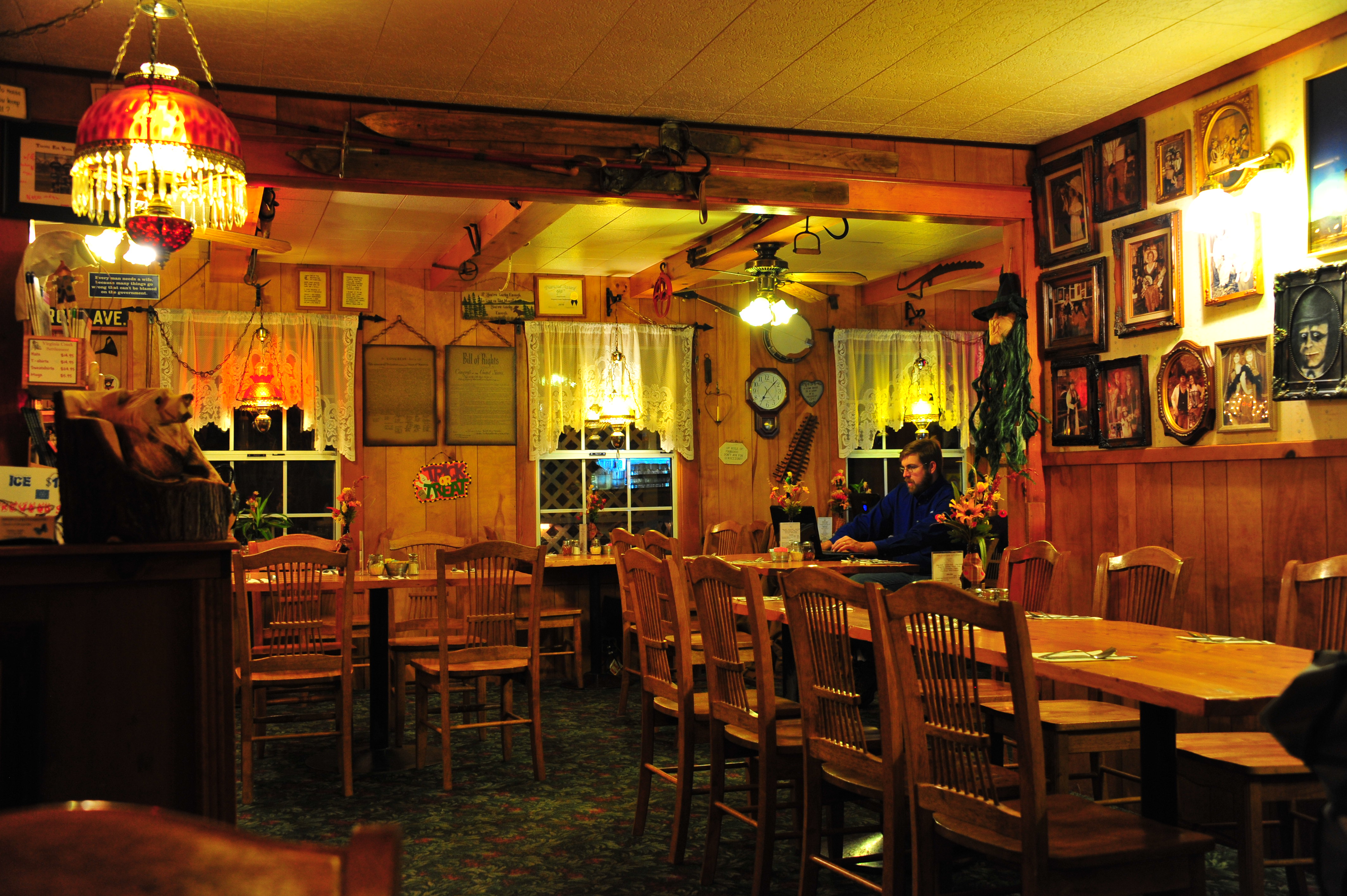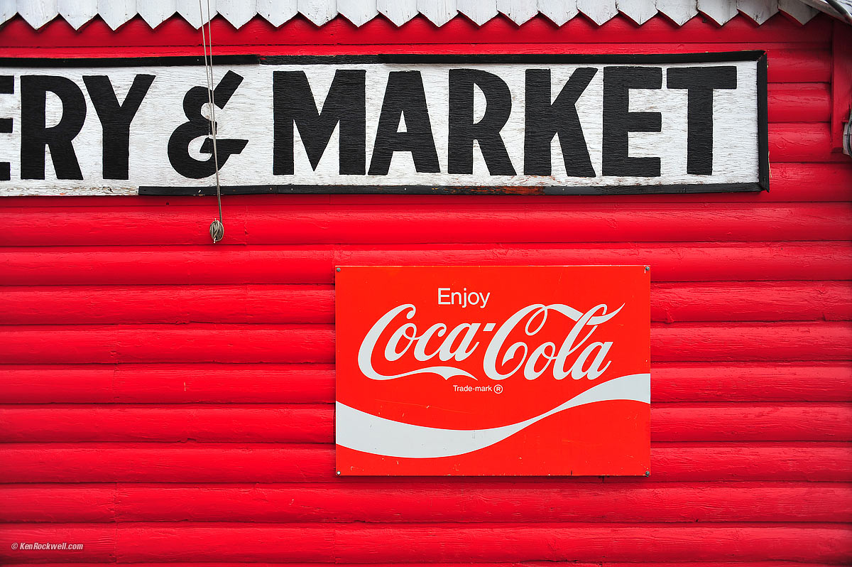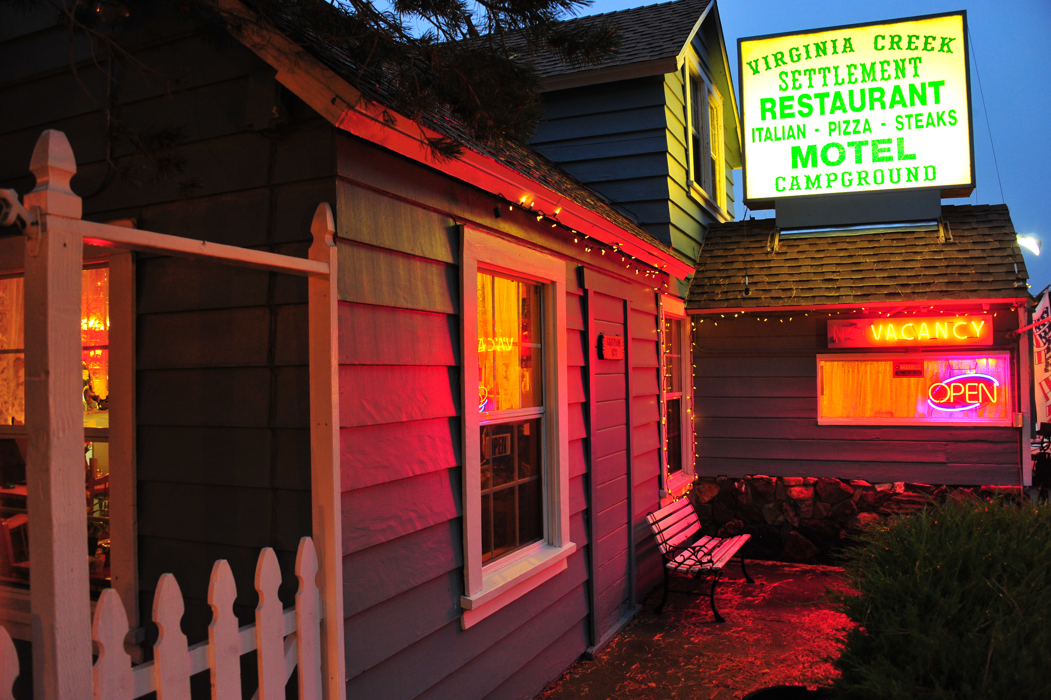 Virginia Creek Settlement. original © file. Snapped on my hand-held Nikon D3 with the 28-300mm VR set to 28mm; aperture-priority set to f/5.6 and the D3 chose 1/8 at ISO 1,000. Focus is on the left window. Looking at the original © file, note that the pole to the left isn't in focus, and the restaurant interior seen on the left is sharp and in focus. The image above is exactly as the JPG came out of the camera for exposure and color. I cropped it to vertical from a more boring horizontal. Focus is on the left window. I also corrected the 28-300's distortion and my crooked hand-holding, which really was only visible on the pole not shown after my crop. Here's the full corrected image before I cropped: