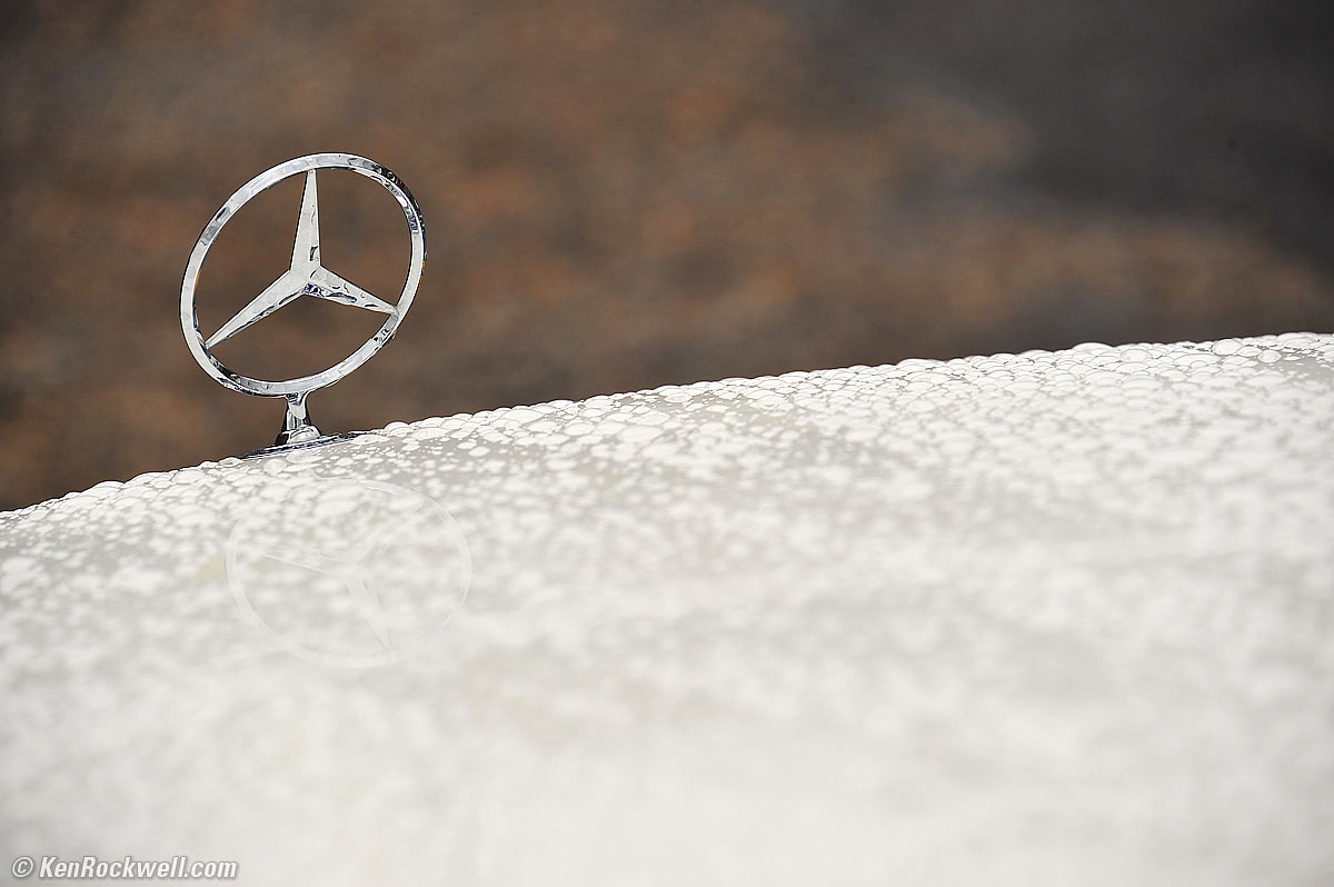 Isolated Excellence. bigger. Snapped with my Nikon D3 with the 28-300mm VR set to 300mm; f/8 at 1/250 at ISO 200. bigger. I shot this in Pro (P) mode and everything set as I leave it. I lightened it a bit later, probably too much. If I was paying attention I'd instead have simply dodged just The Star so the white hood doesn't distract as much as it does here. Note how the 28-300mm, at 300mm, isolates a subject, even at f/8. All 300mm lenses do this, but you have to know to set a zoom to 300mm if you want this much isolation. I paid less for this used Mercedes four years ago than I could have spent for a brand-new Toyota Camry or Ford Taurus. See How to Afford Anything for how I afford all this — for less.