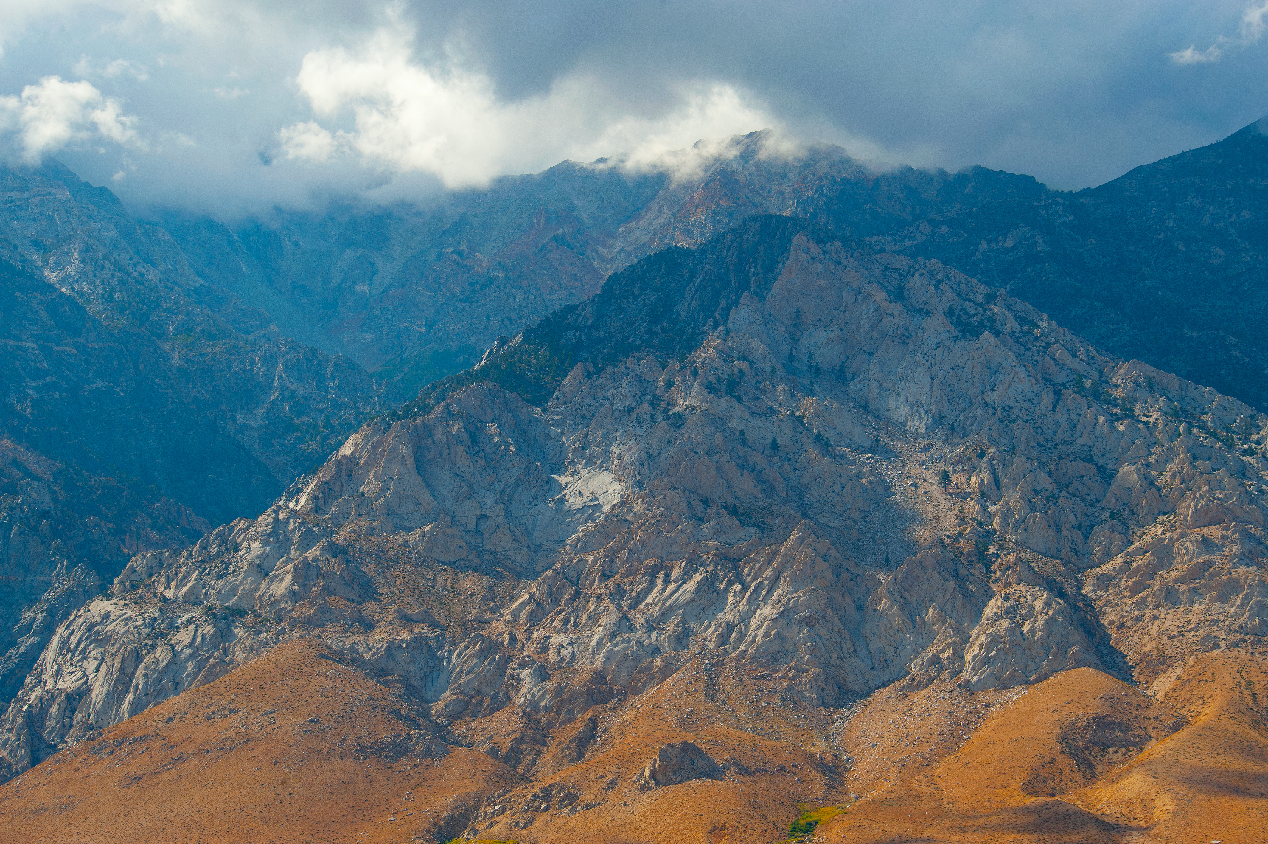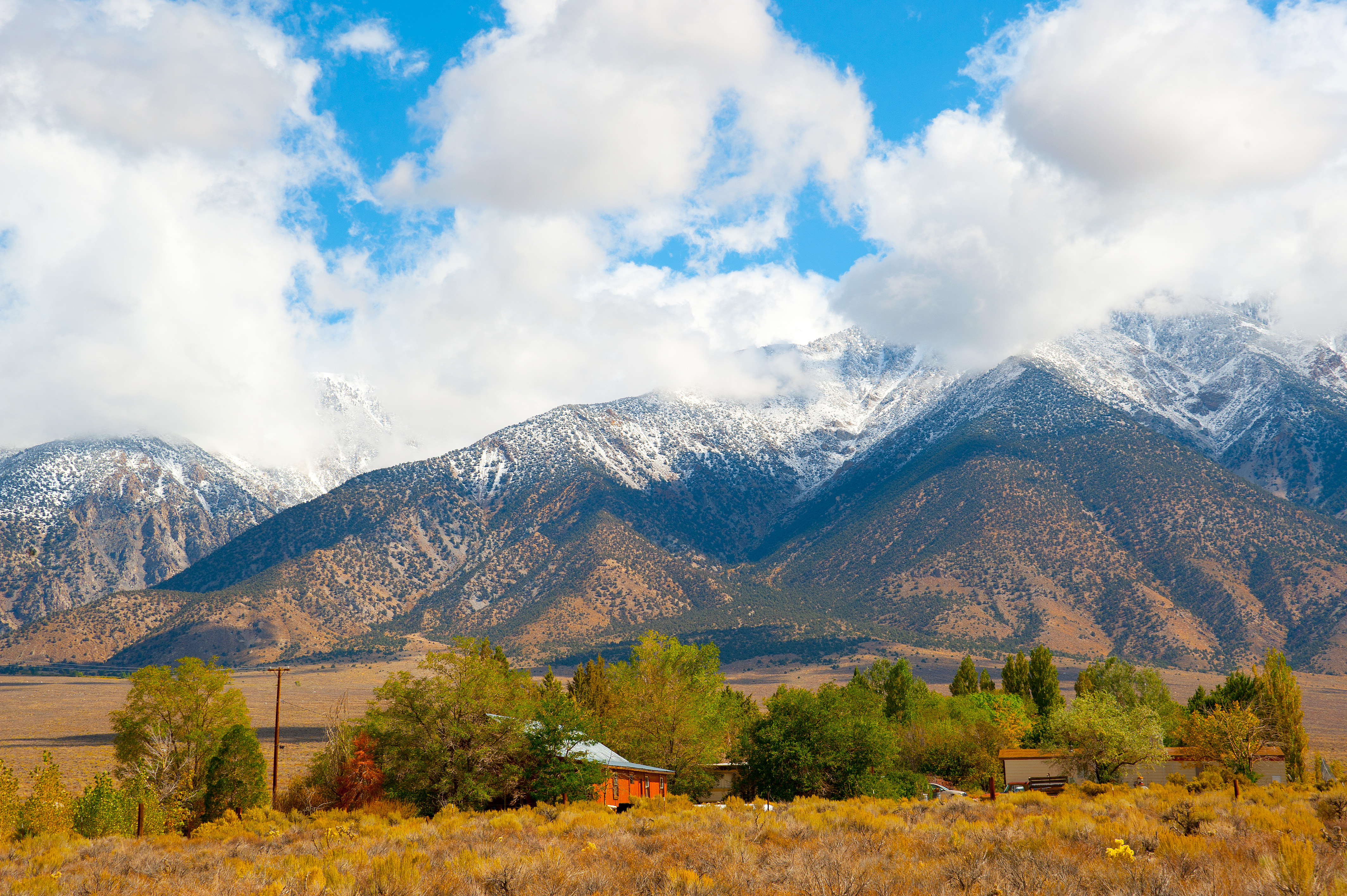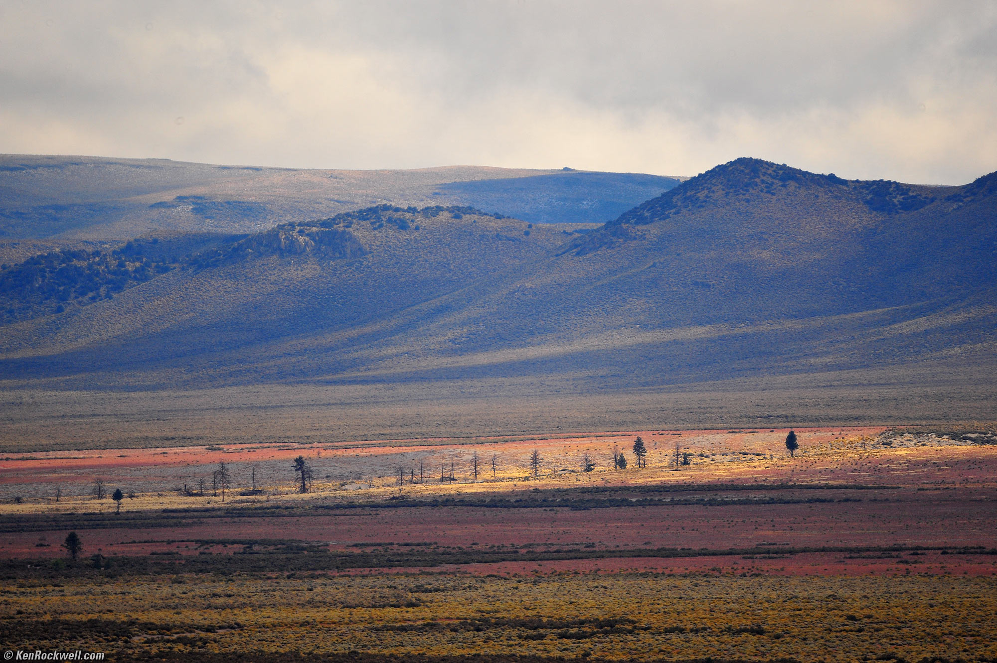 Home Donate New Search Gallery How-To Books Links Workshops About Contact California's Eastern Sierra These are snaps from a short trip to California's Eastern Sierra to run some of Canon and Nikon's newest gear through its paces. Click any image to make it bigger, or to get the original file. All are exactly as shot in JPG unless otherwise noted. All the colors you see are exactly what came out of the camera. A couple were shot in NEF, as noted, and these of course will open differently depending on how you open them and which software you use. For the NEF shots, the in-camera JPGs are what I show on this page, and the full-resolution files created from the NEFs are at the links. Everything is shot hand-held; I don't need no stinking tripod. With VR, why bother? No one wants to carry any more junk. My D3 is set to VIVID Picture Control and +3 saturation to get these wild colors. I usually shoot in Professional (P) exposure mode, with AUTO ISO set to ISO 200 normal, ISO 6,400 max. I set Auto ISO to 1/8 second at shorter zoom settings, and 1/125 at the 300mm end. I shoot in Auto white Balance, with the trim set to A3.