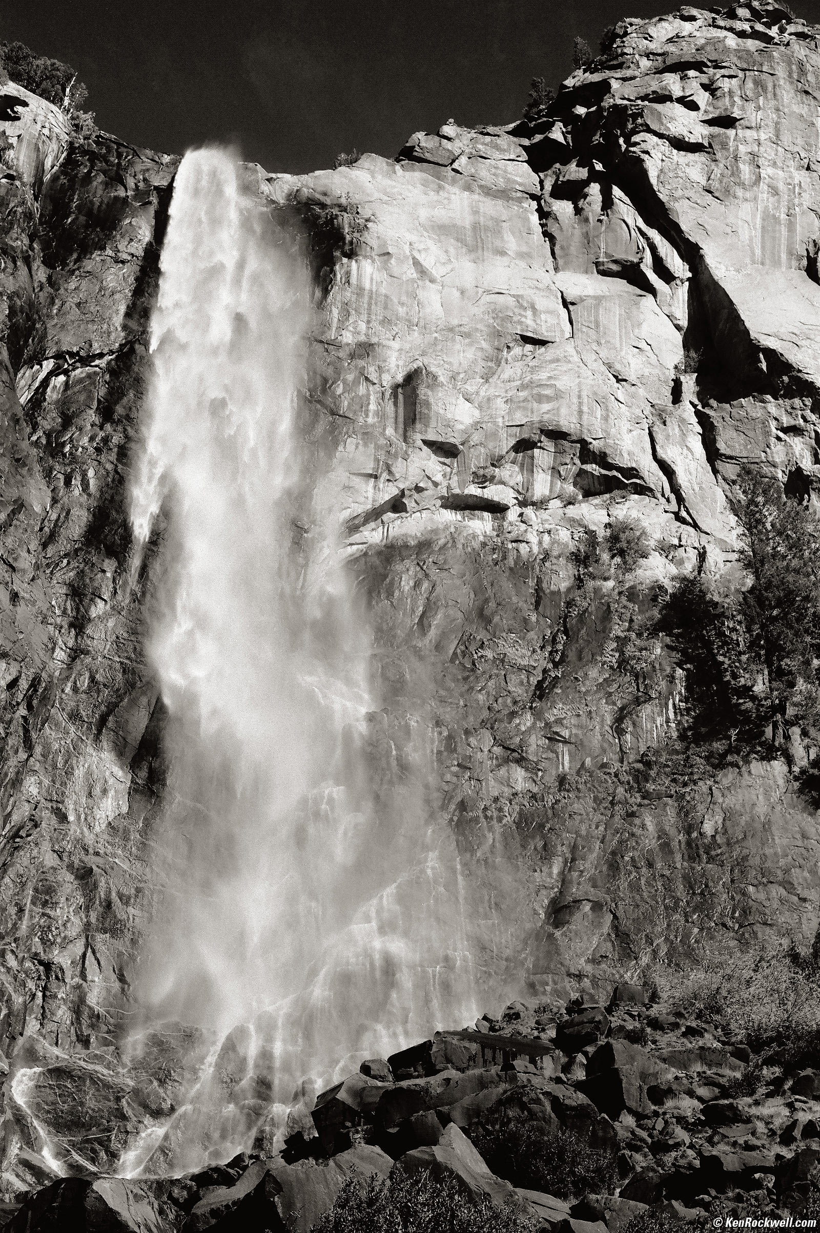 Bridal Veil Falls, Yosemite Valley, 5:04 PM. (1955 LEICA M3, 1957 LEICA SUMMICRON 50mm f/2 with near-focussing range, LEICA Orange filter, f/5.6 at 1/50 as read by LEICAMETER MR-4, expired Ilford Pan-F Plus 50, North Coast Photo Services process and scan, Athentech Perfectly Clear, split-toned print.) bigger.
