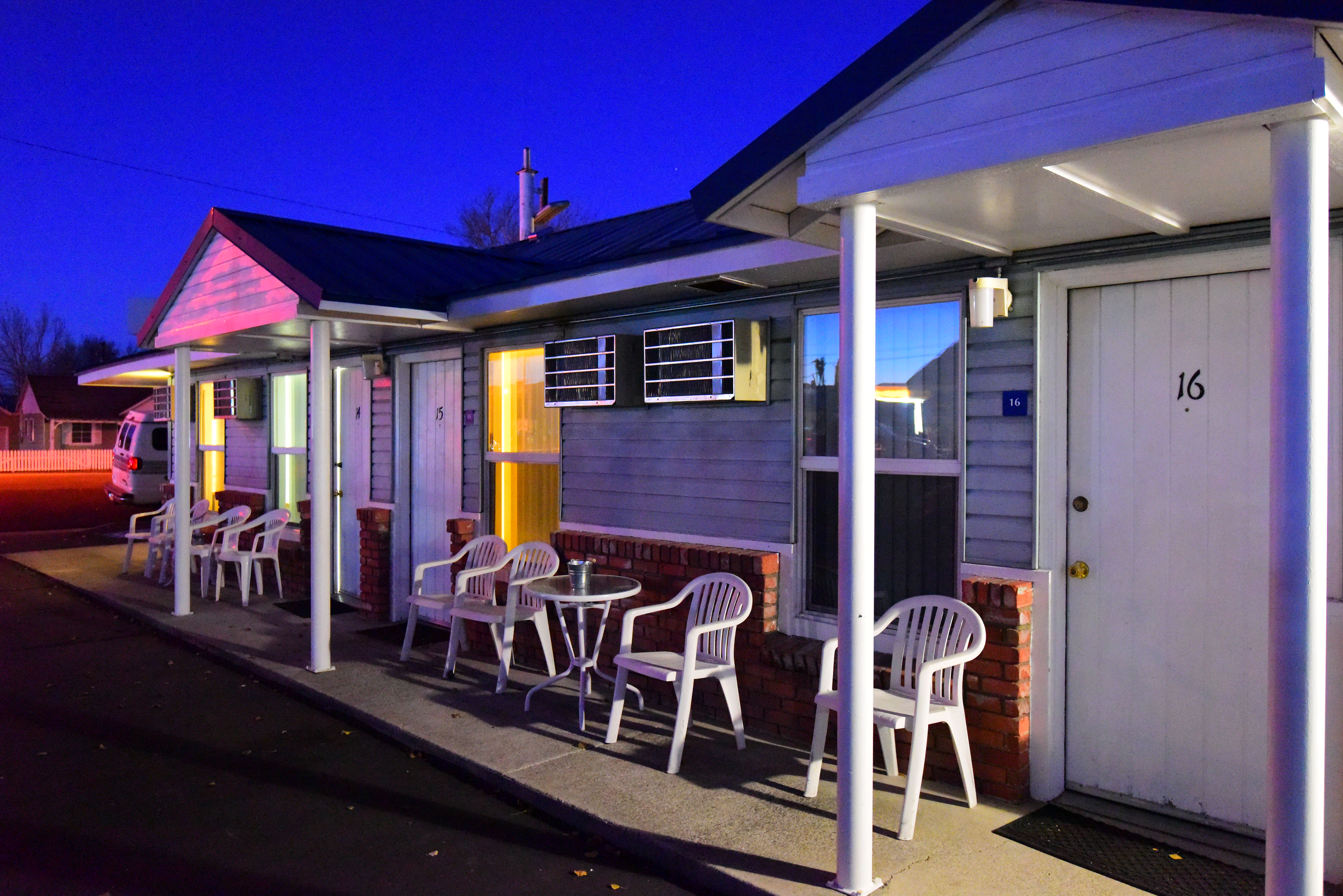 Redwood Motel after Dusk, Bridgeport, 6:52 PM. (Nikon D810, Nikon 16-35mm VR at 26mm, f/4 at 1/15 hand held at ISO 16,000/Hi-0.3, Athentech Perfectly Clear v2.) Camera-original © LARGE BASIC JPG.
