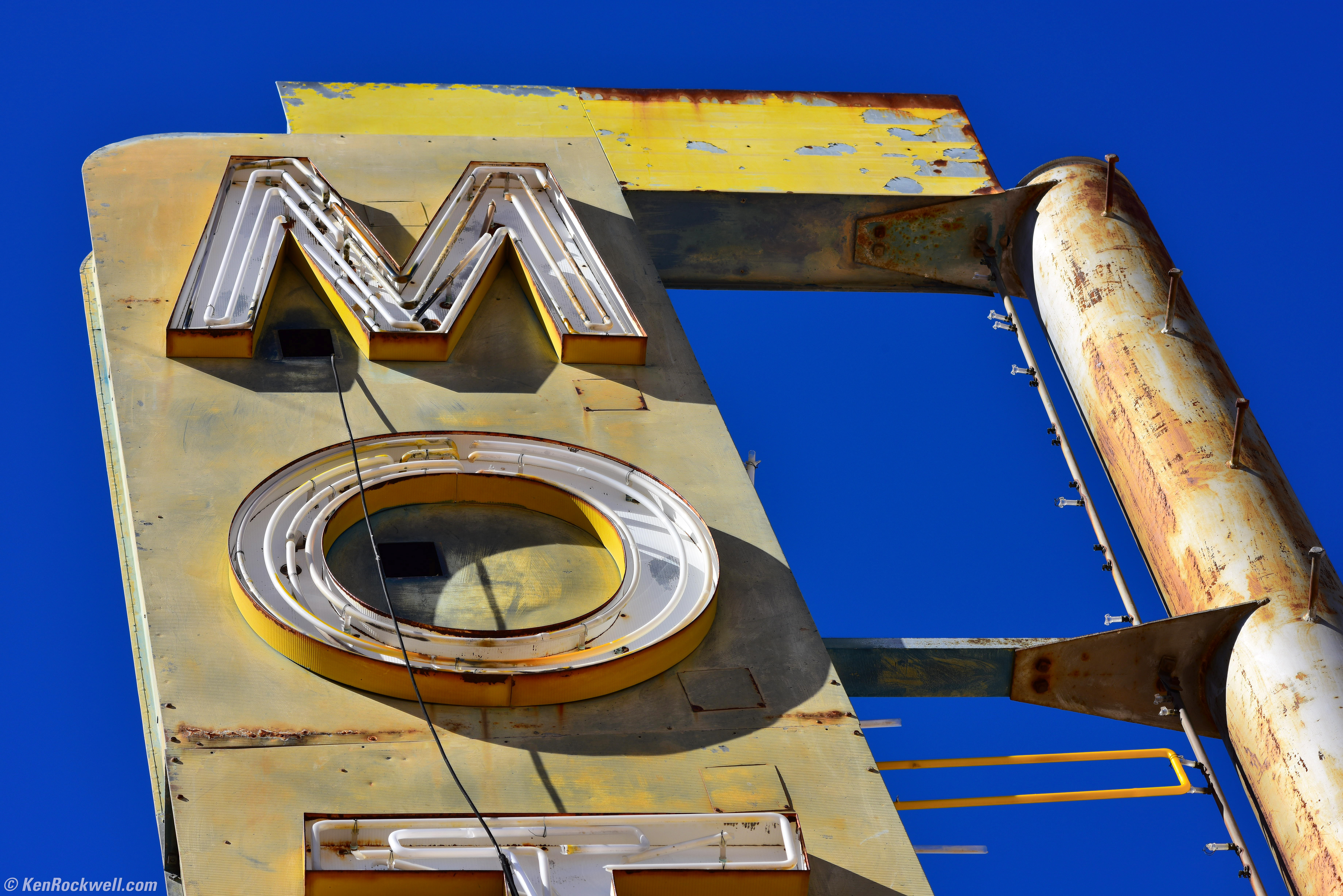Abandoned Route 66 Gas Station in Black-and-White, 1:14 PM. Nikon D810, Nikon 18mm f/4 NIKKOR AI, f/11 at 1/250 at Auto ISO 100, split-toned print. And farther east: