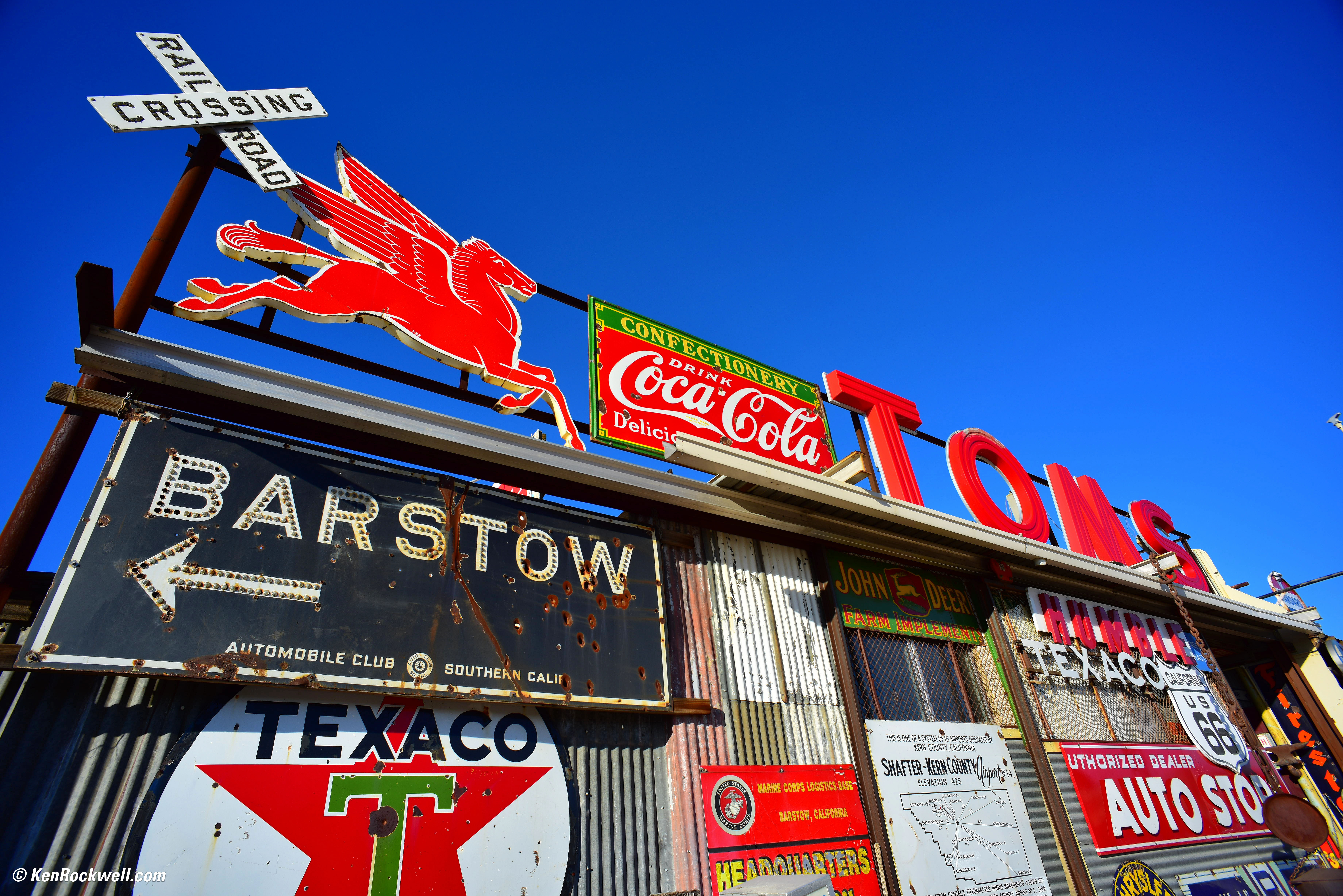 Old Metal Signs, Barstow, 3:40 PM. Nikon D810, Nikon 18mm f/4 NIKKOR AI, f/5.6 at 1/20 hand-held at Auto ISO 450.