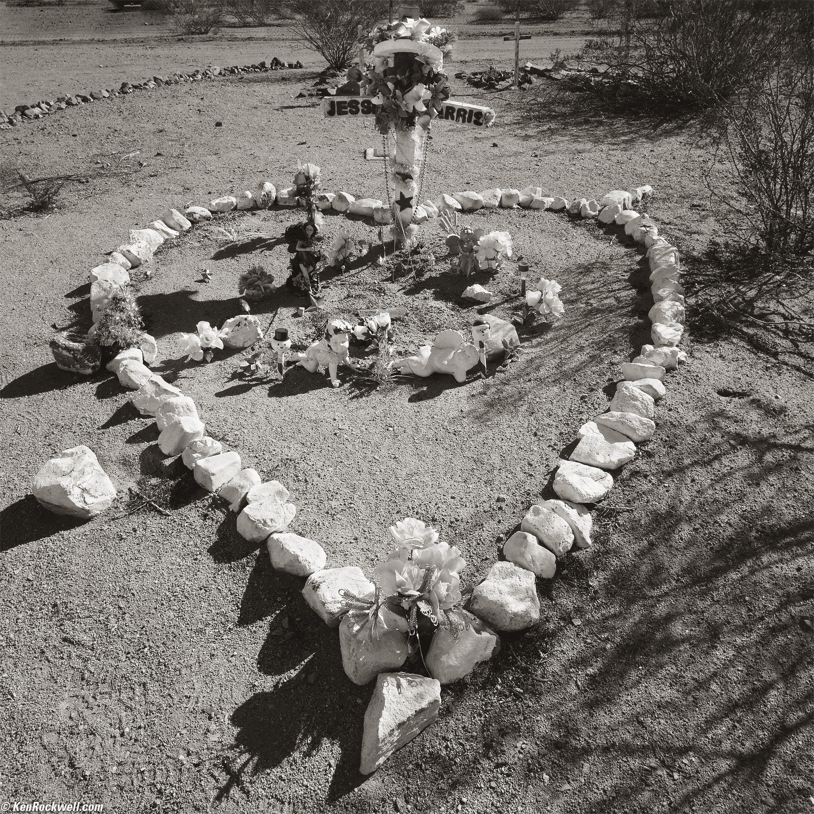 Stone Heart Around Grave, Daggett, 10:37 A.M. 1989 Hasselblad 903 SWC, no filter, 1.2 meter focus distance, Kodak T-Max 100 in 1993 A12 magazine, f/22 at 1/30. More technical details. bigger. I wanted light in the shadows and there was no sky in the picture, so I used no filter. This makes blues — or shadows which are also blue – get a bit lighter than they seem to our eyes.