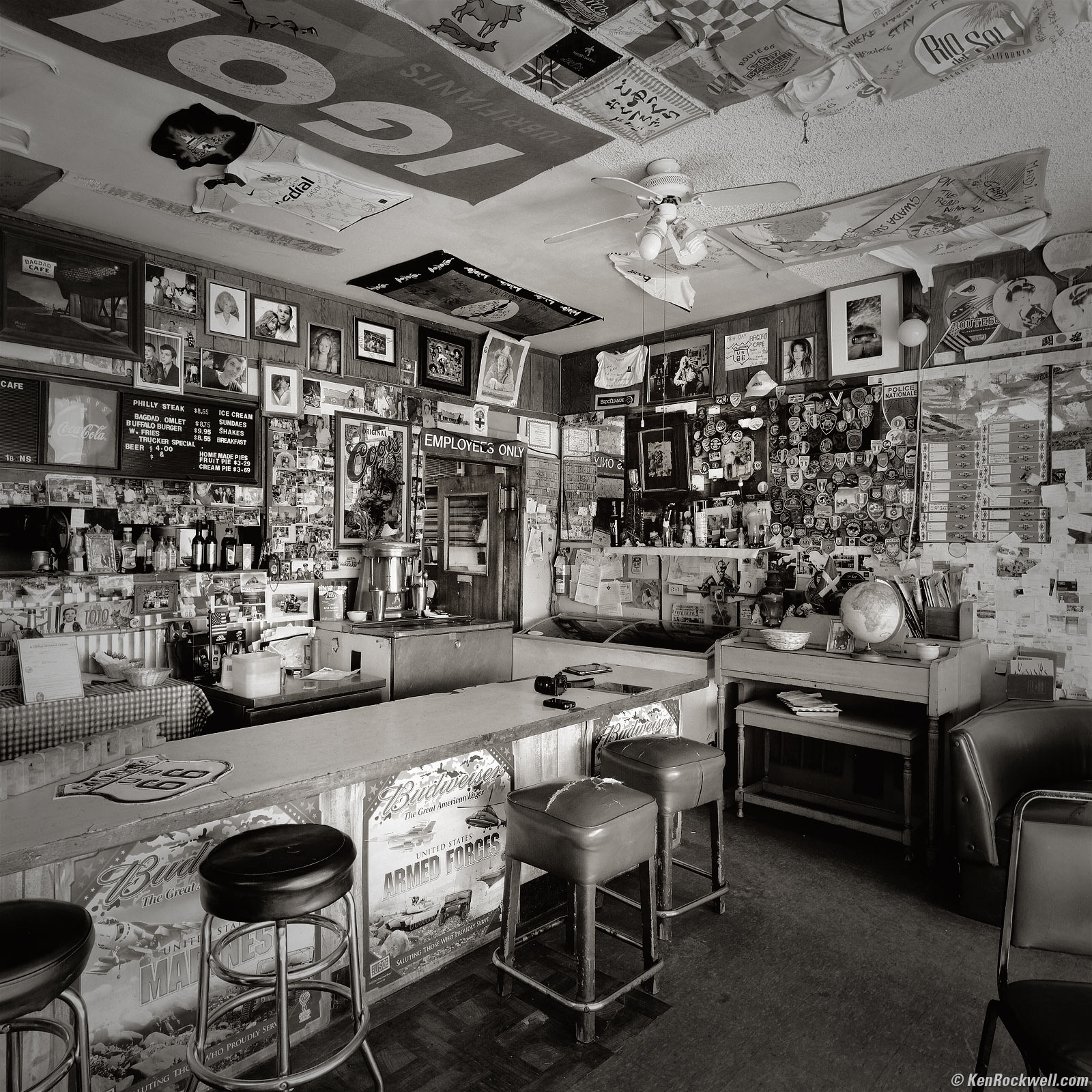Inside the Bagdad Cafe, Route 66, 12:04 P.M. 1989 Hasselblad 903 SWC, no filter, 12 foot focus distance, Kodak T-Max 100 in 1993 A12 magazine, Gossen Luna Pro SBC read EV 8, f/16 at one second. More technical details. bigger.