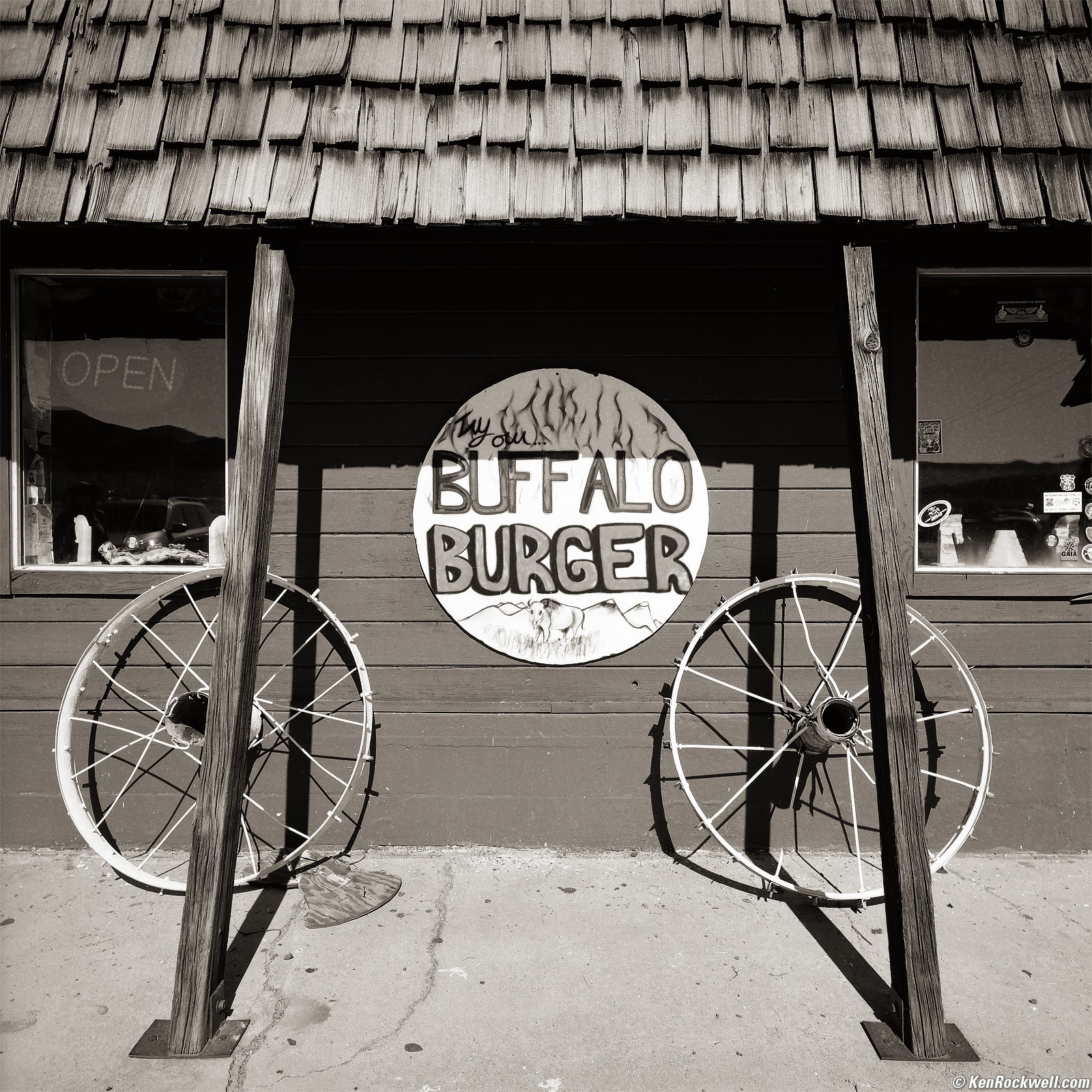 Buffalo Burger, Route 66, 12:11 P.M. 1989 Hasselblad 903 SWC, no filter, 7 foot focus distance , Kodak T-Max 100 in 1993 A12 magazine, Gossen Luna Pro SBC read EV 12, I needed from 6 to 10 feet with optimum sharpness which lead to selecting f/11. Selecting f/11 and EV 12 solved and set for 1/30 exposure time on the SWC's analog computer. More technical details. bigger.