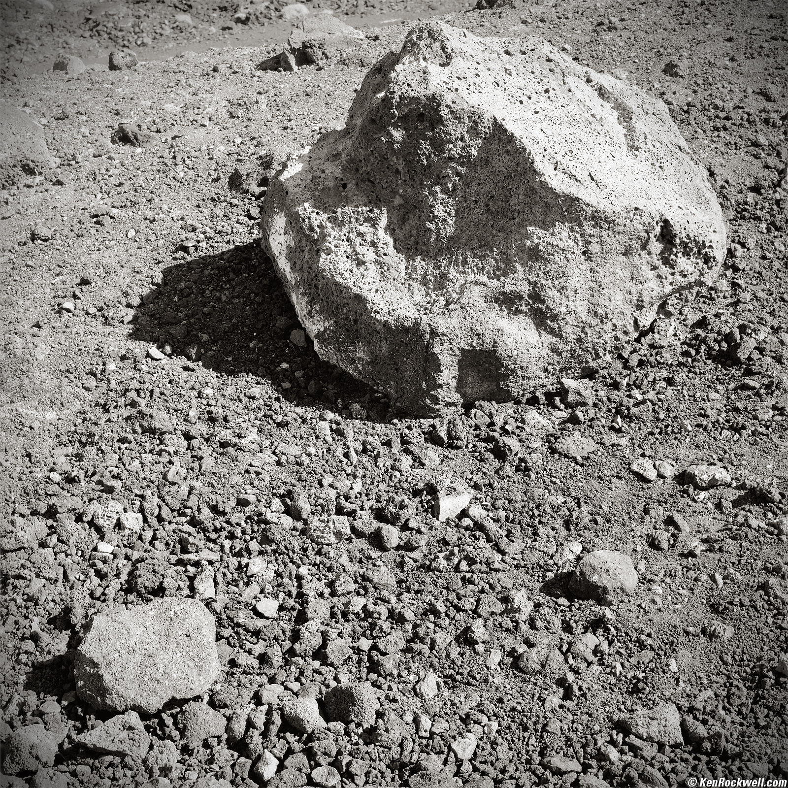 Two Volcanic Rocks, Pisgah Crater, Route 66, 1:00 P.M.1993 Zeiss Planar T✻ 80mm f/2.8 CF, no filter (to keep detail in the shadows), 8 foot focus distance,1992 Hasselblad 503 CX with 1985 PME metered prism reading EV 12, Kodak T-Max 100 in 1993 A12 magazine, f/22 at 1/8. More technical details. bigger. Laugh all you want, but it takes a long time to position my camera to put the rocks in my frame with this relationship between the two or three of them and the edges of my frame.