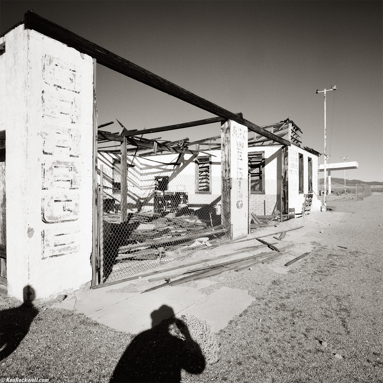 Shadows of Two Old Men From the Past at an Abandoned Filling Station, Route 66, 3:02 P.M. 1989 Hasselblad 903 SWC, Hoya B60 Orange filter, 20 foot focus distance , Kodak T-Max 100 in 1993 A12 magazine, Gossen Luna Pro SBC read EV 13 at EI 64 through-the-filter, f/16 at 1/30. More technical details. bigger.