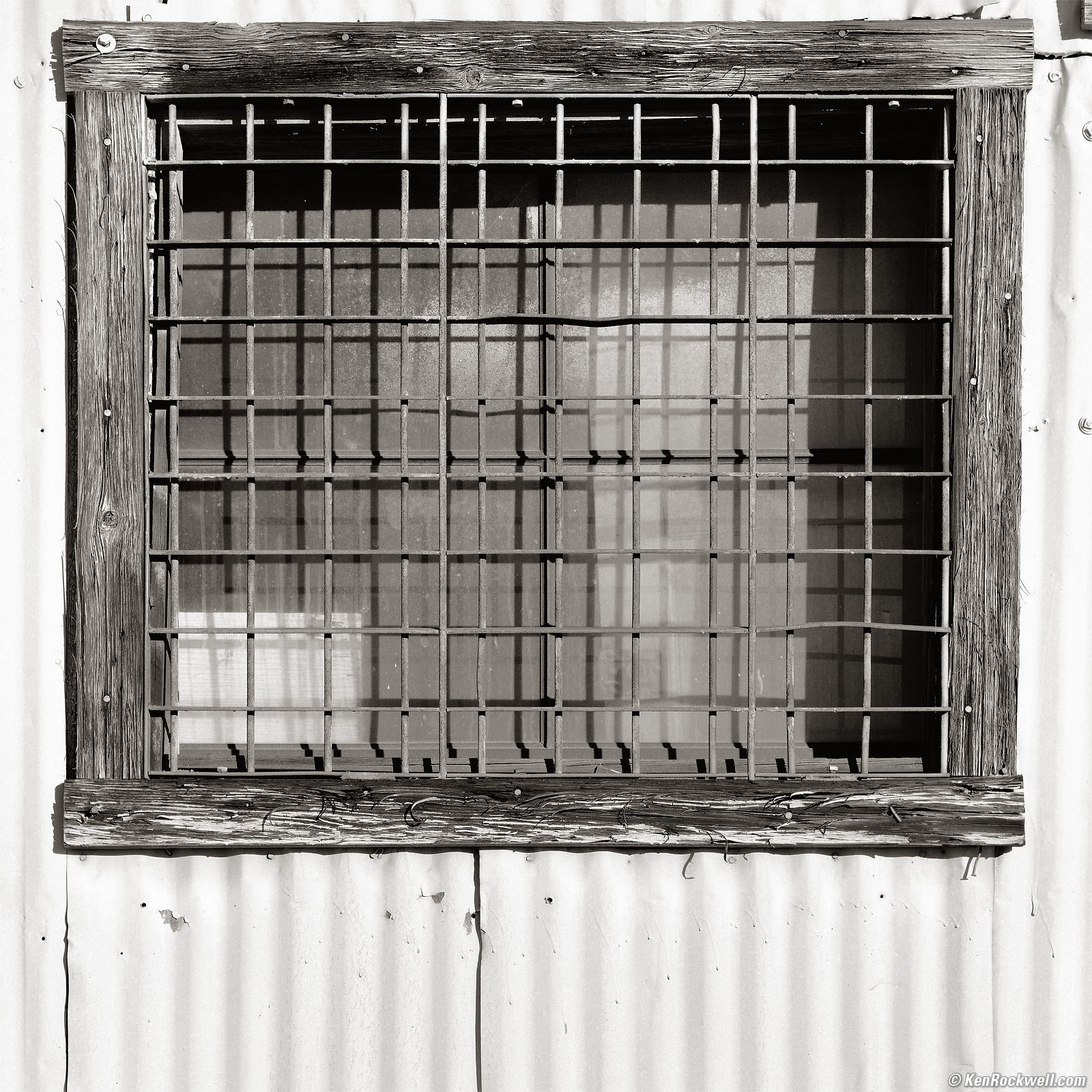 Old Window, Route 66, 3:57 P.M. 1987 Zeiss Sonnar T✻ 150mm f/4 CF with Heliopan B60 Yellow filter, 5 meter focus distance, 1992 Hasselblad 503 CX with 1985 PME metered prism which read EV 14/15, Kodak T-Max 100 in 1993 A12 magazine, f/9.5 at 1/250. More technical details. bigger.