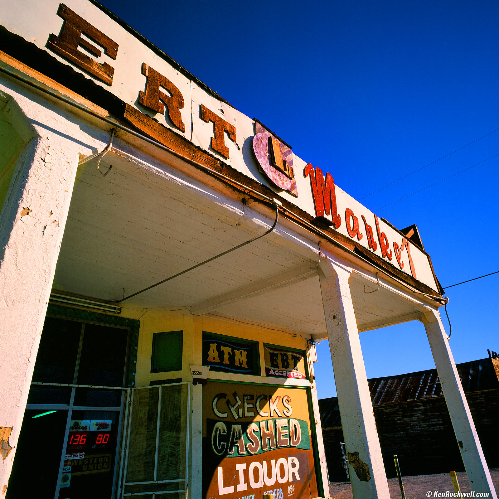 Route 66 Desert Market, Daggett, 9:36 A.M. 1989 Hasselblad 903 SWC with Hasselblad B60 CR 1,5 warming filter, 15 feet focus distance, Fuji Velvia in 1996 Hasselblad E24 magazine, Gossen Luna Pro SBC read EV 13 at ISO 40, f/11 at 1/60. More technical details. bigger.