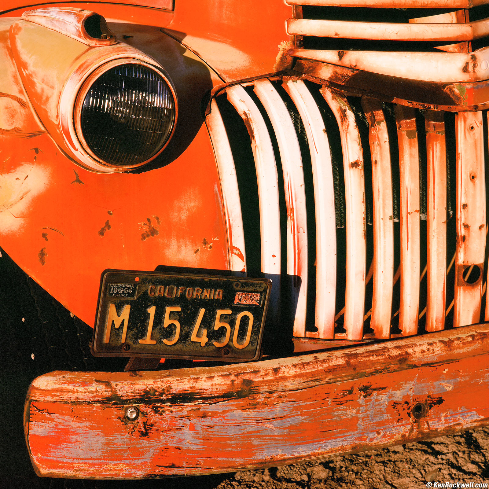 Old Orange and White Truck, Route 66, 4:14 P.M. 1987 Zeiss Sonnar T✻ 150mm f/4 CF with Hasselblad B60 CR 1,5 warming filter, 3 meters focus distance, 1992 Hasselblad 503 CX with 1985 PME metered prism reading EV 13/14, Fuji Velvia in 1996 Hasselblad E24 magazine, f/19 at 1/30. Gossen Luna Pro SBC says EV 13 incident at ASA 40. More technical details. bigger.