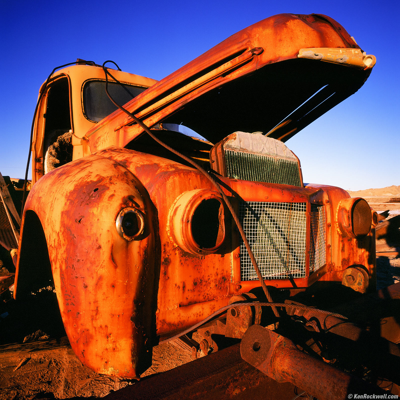 Old Orange Truck with Hood Up, Route 66, 4:36 P.M. 1989 Hasselblad 903 SWC with Hasselblad B60 CR 1,5 warming filter, 4.2 foot focus distance (I needed the range from 3 to 9 feet rendered with optimum sharpness), Fuji Velvia in 1996 Hasselblad E24 magazine, Gossen Luna Pro SBC reads EV 11/12 at ISO 40, f/19 at 1/8. More technical details, including the viewfinder view through the SWC! bigger.