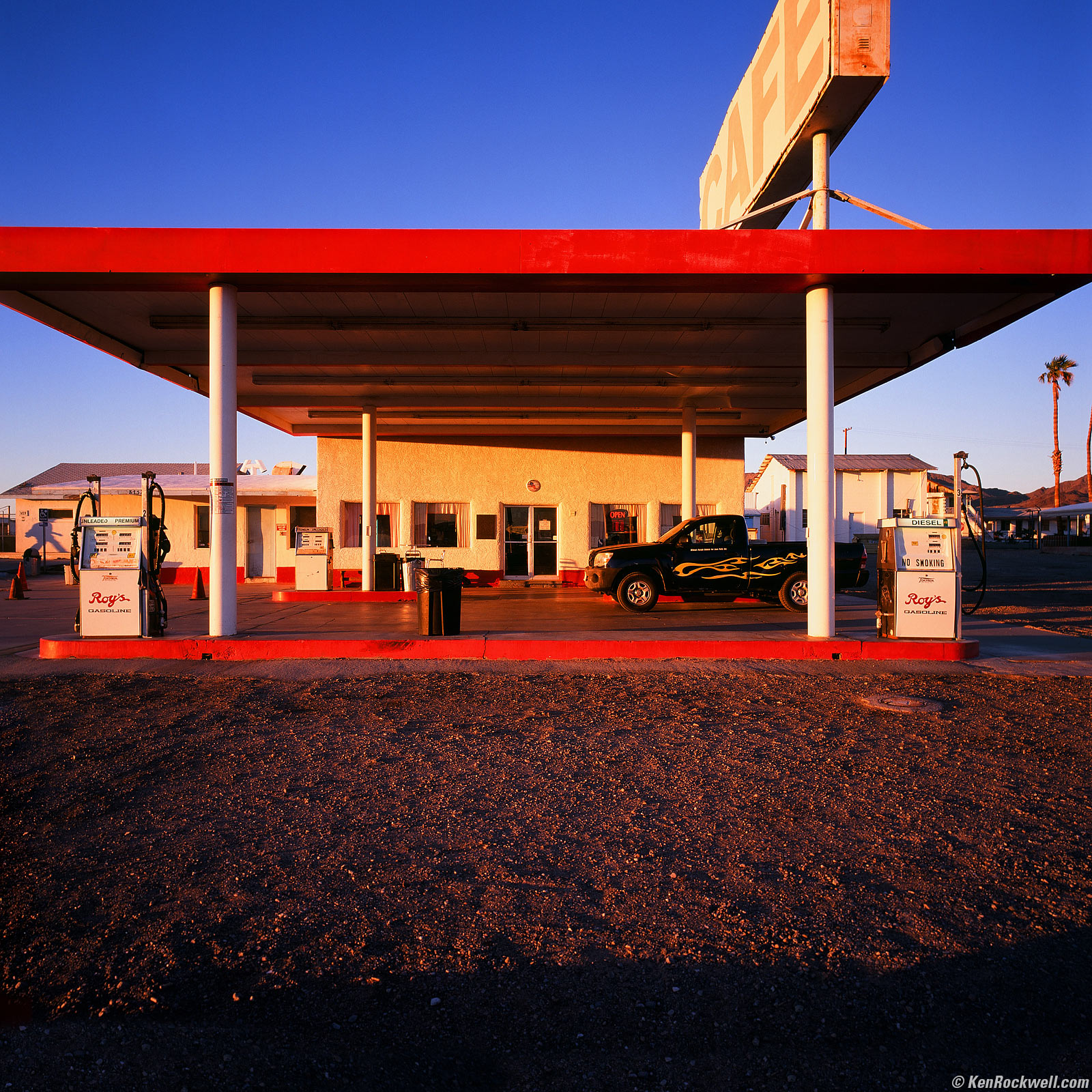 Roy's Sign by Starlight, Route 66, 5:22 ~ 5:55 P.M. 1993 Zeiss Planar T✻ 80mm f/2.8 CF with Hasselblad B60 CR 1,5 warming filter, 50 foot focus distance, 1992 Hasselblad 503 CX with 1985 PME metered prism, Fuji Velvia in 1996 Hasselblad E24 magazine, f/5.6 at 3 minutes and 33 seconds. bigger. My Gossen Luna Pro SBC read EV -1 at ISO 40 at the beginning of the exposure. I chose f/5.6 to get the lack of vignetting I wanted, and EV -1 at f/5.6 needs 1 minute on the meter. My reciprocity calculations tell me to use 2½ minutes to get the right exposure on film for 1 minute as read on the meter, so I used f/5.6 and started my exposure. As the exposure continued the light dropped to EV -2, so I sat around for a total of 3½ minutes. The streaks in the sky are star trails. From here we headed to Peggy Sue's for dinner, a photo of which you can see at technical details.