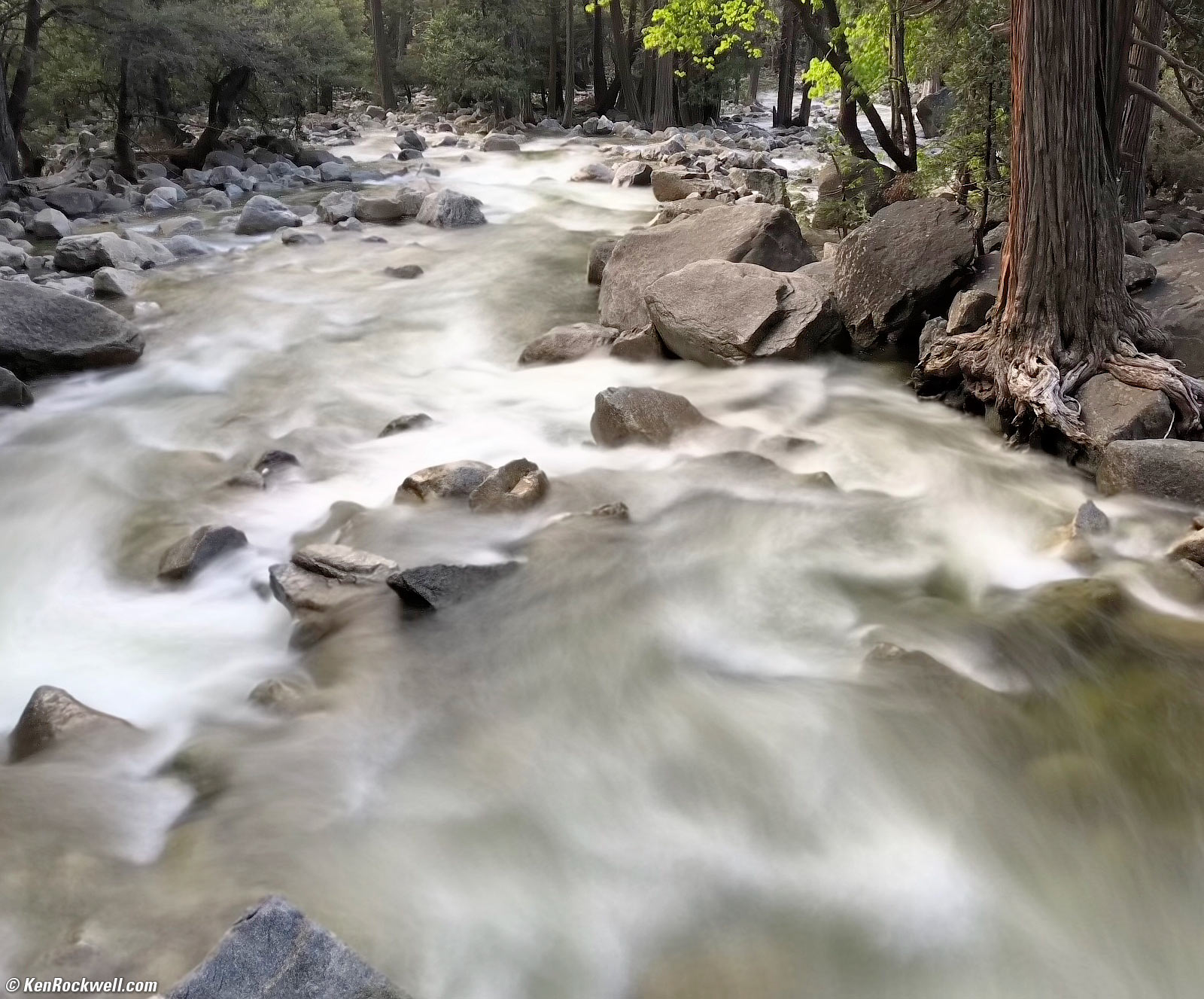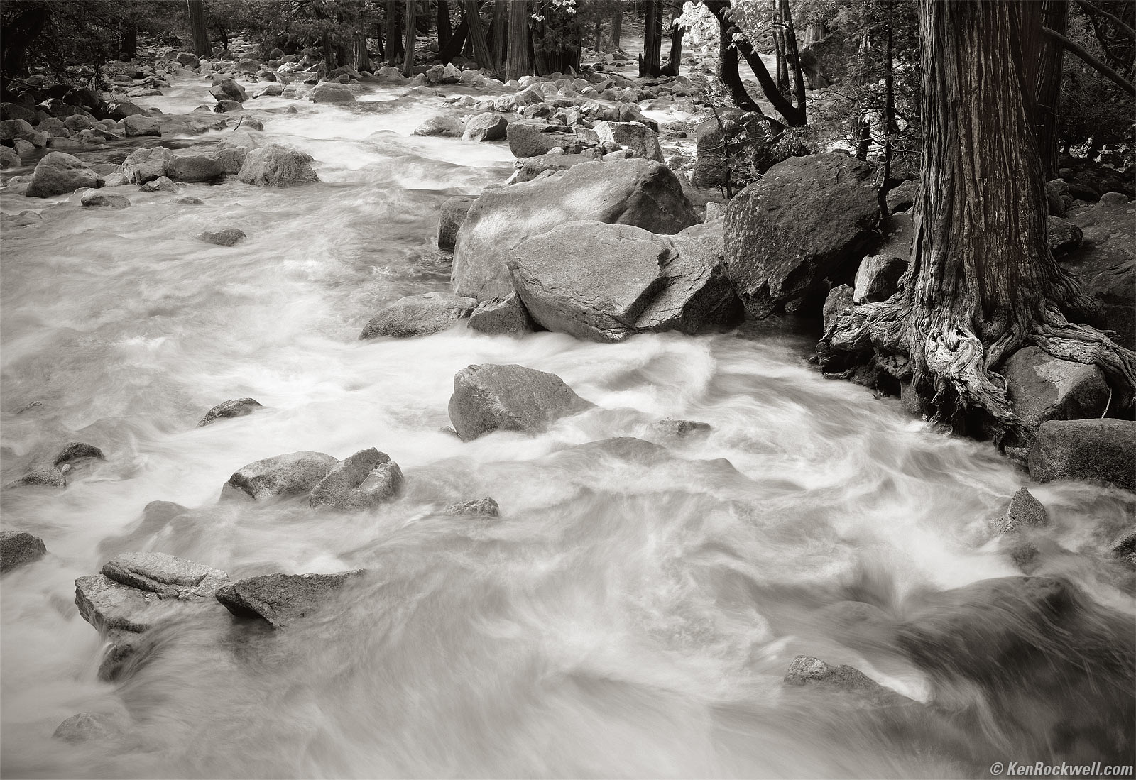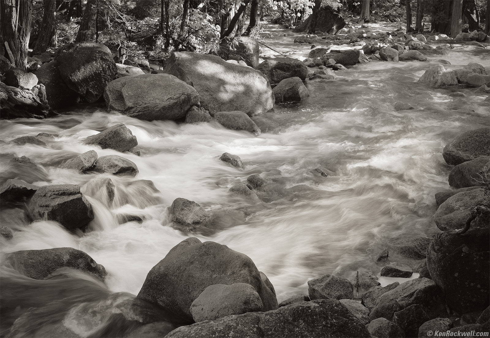 Water Flow in Yosemite Creek, 7:43 A.M. Kodak Medalist II at f/11● at 1/2 at 55 feet, Nikon Y48 Yellow filter, Kodak TMX100. bigger.