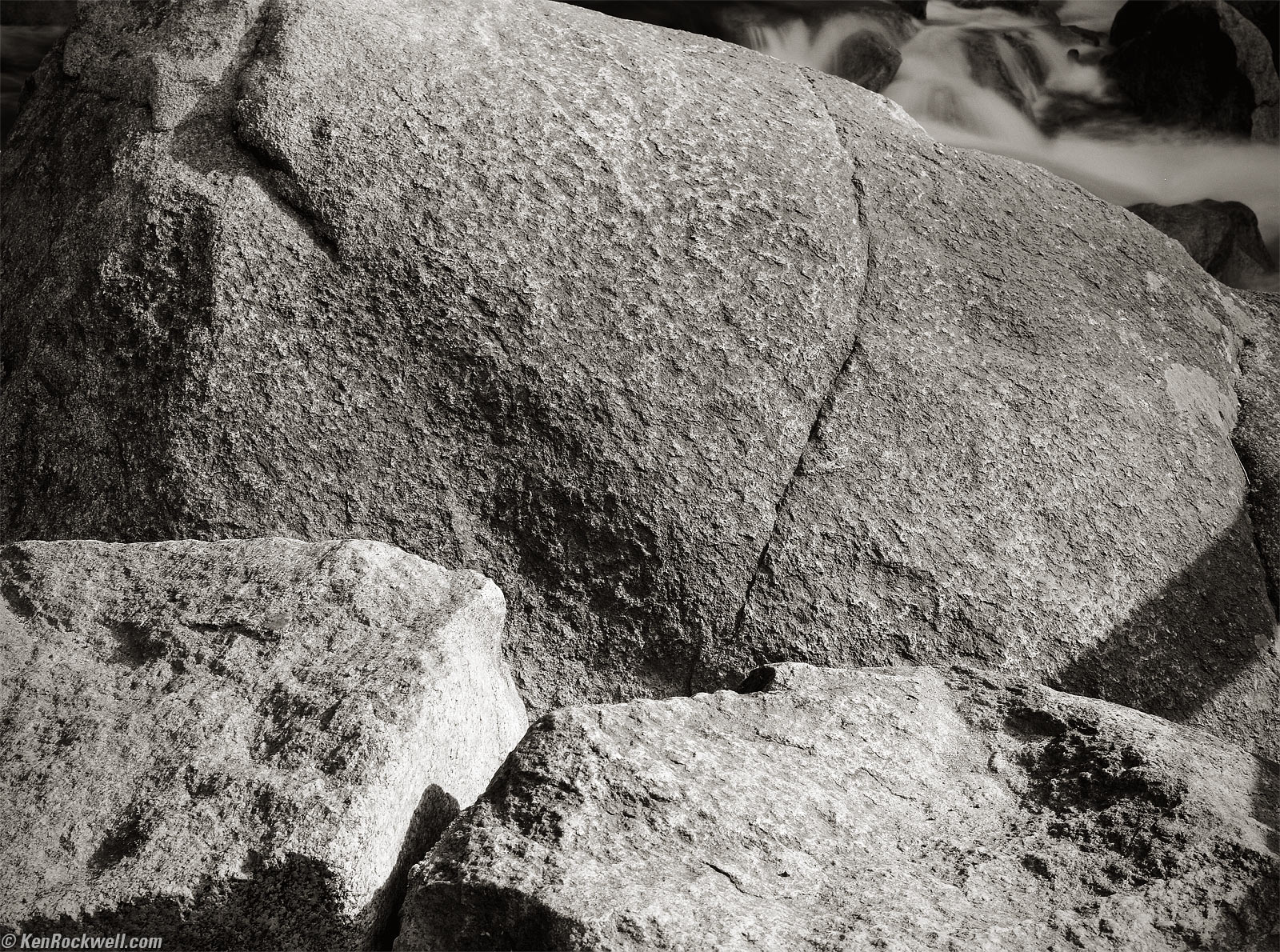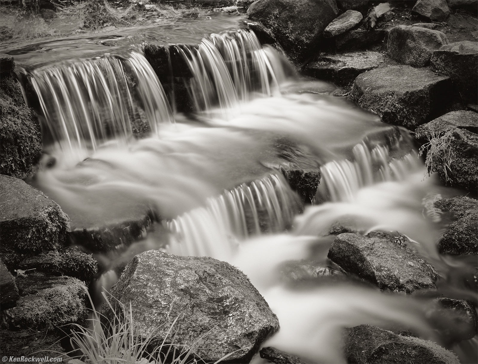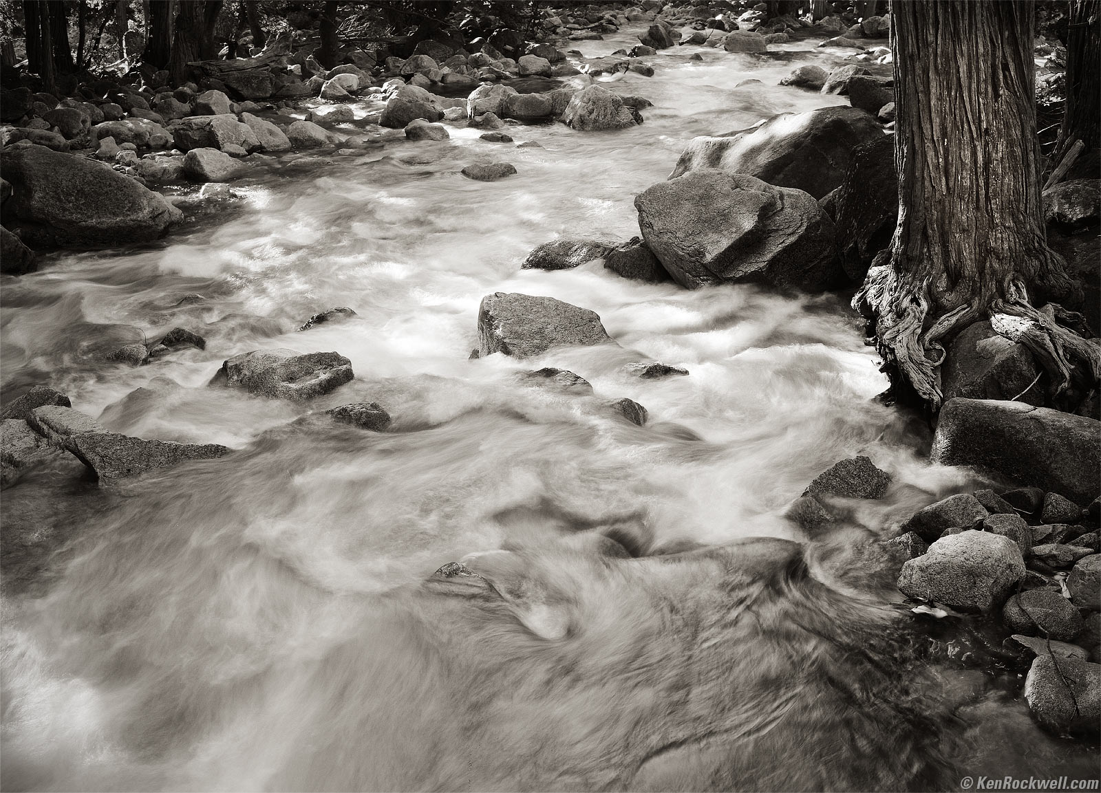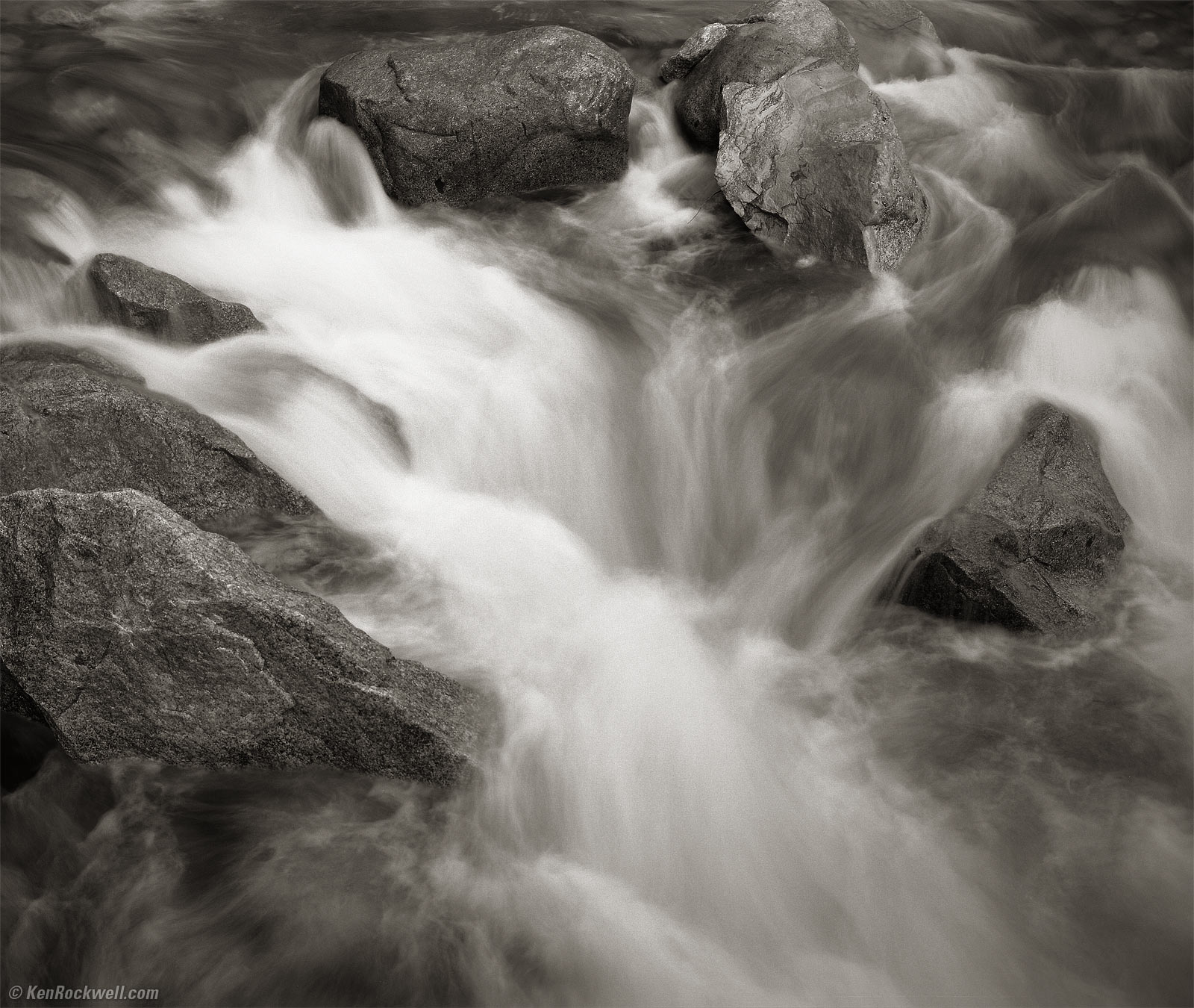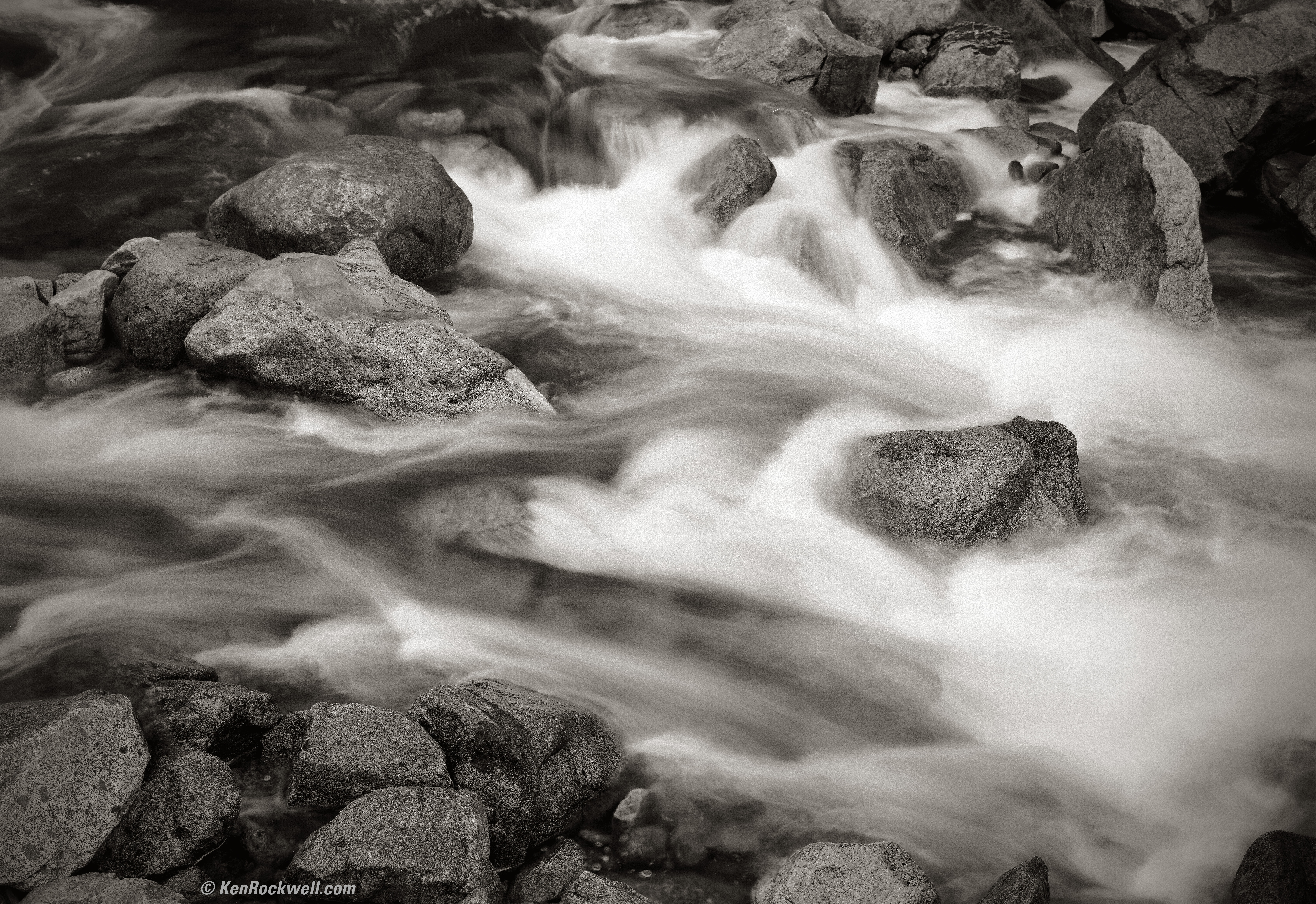 Water Flow in Yosemite Creek, 7:52 A.M. Kodak Medalist II at f/16 at 1/2, Nikon Y48 Yellow filter, Kodak TMX100. bigger.