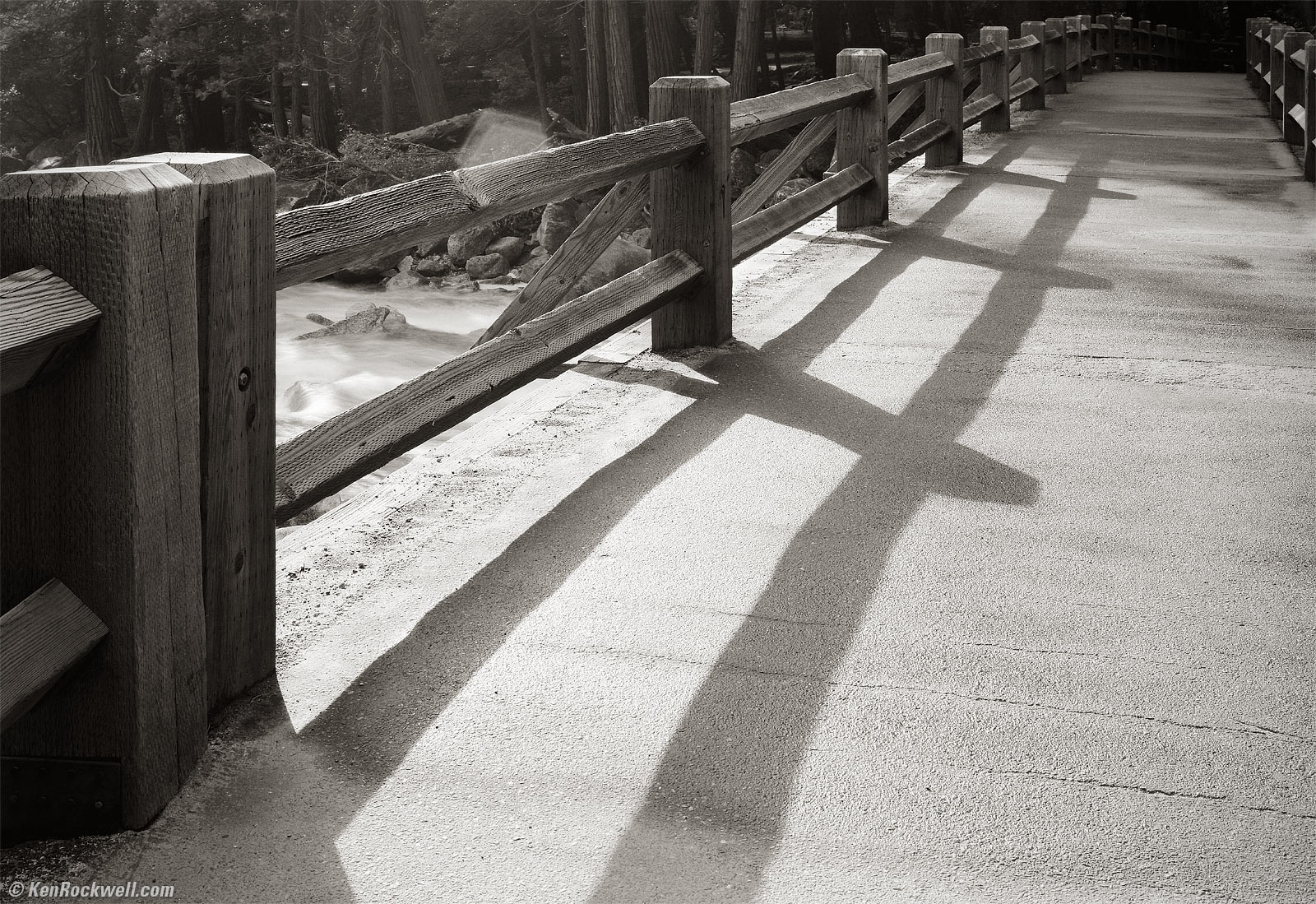 Bridge over Yosemite Creek, 8:02 A.M. Kodak Medalist II at f/32 at 1 second at 24 feet, Nikon Y48 Yellow filter, Kodak TMX100. bigger.
