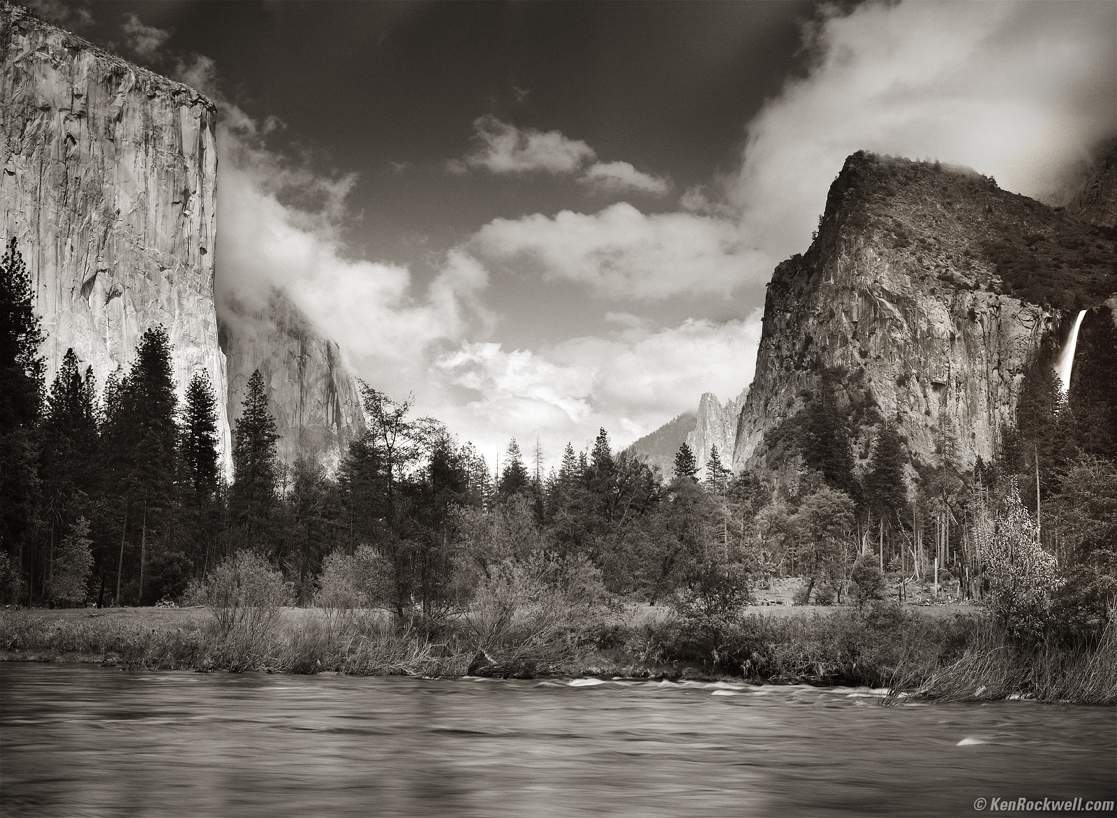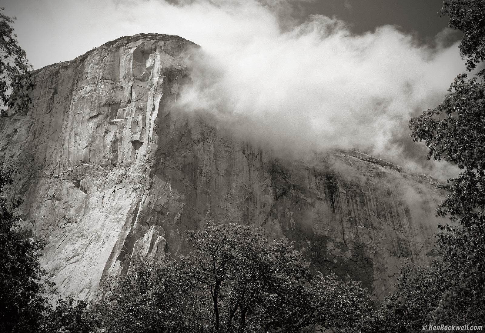 El Capitan in Clouds, 2:37 P.M. Kodak Medalist II at f/11 at 1/10 at infinity, Nikon R60 (25A) Red filter, Kodak TMX100. bigger. What may look like lens blur is the trees blowing in this long exposure.
