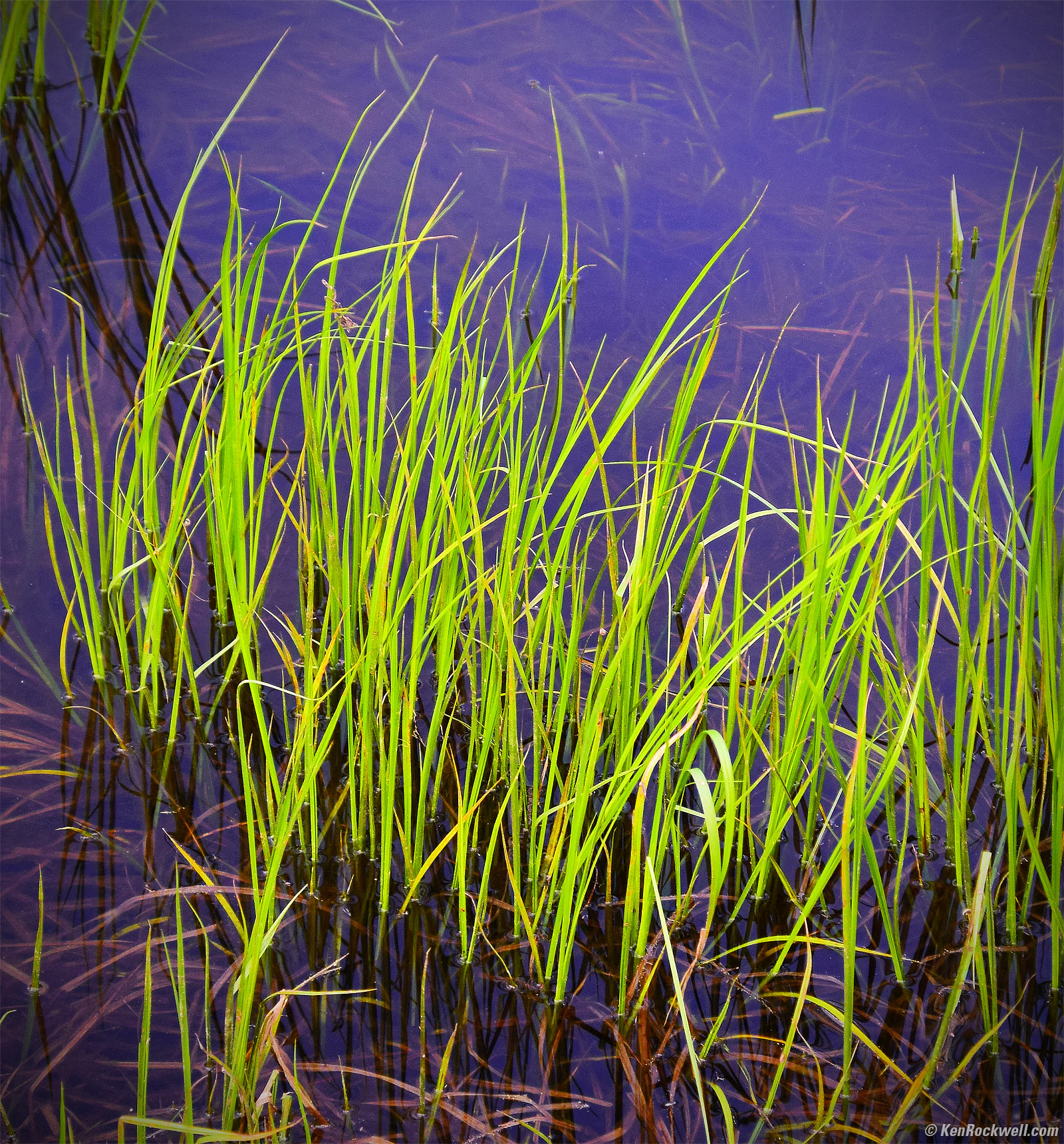 15 May 2018, TuesdayBright Green Spring Grass in Purple Water, 7:09 P.M. Nikon D3300, Tamron 18-400mm at 50mm, f/4.5 at 1/80 at Auto ISO 450, Perfectly Clear v3.5. bigger.