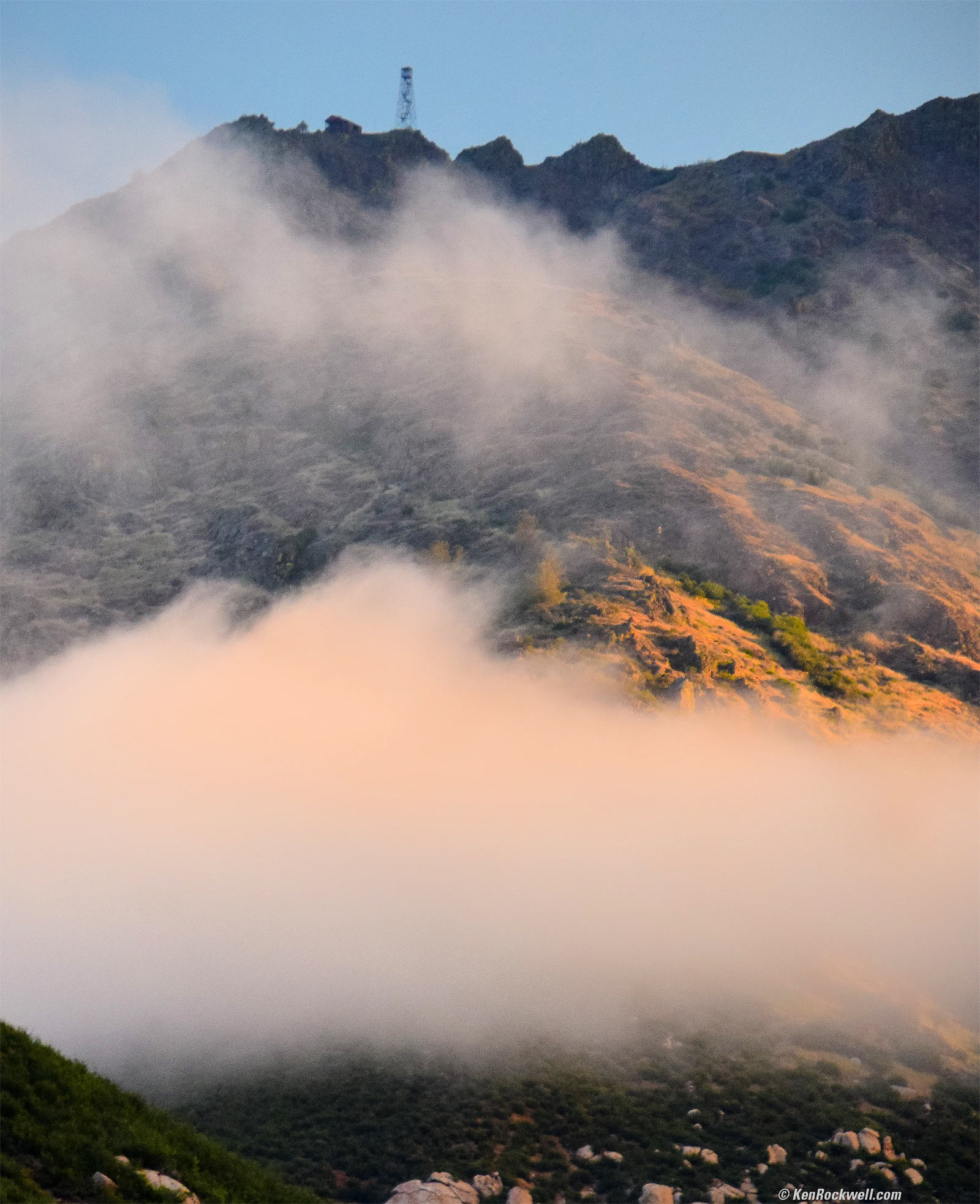 16 May 2018, WednesdayHills in Clouds at Dawn with Watch Tower, 6:23 A.M. Nikon D3300, Tamron 18-400mm at 135mm, f/5.6 at 1/200 at Auto ISO 1,100, Perfectly Clear v3.5. bigger.